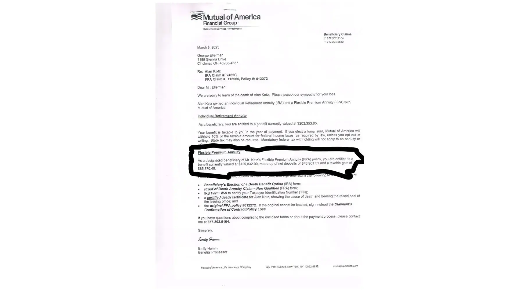 I would like this company to fulfill its fiduciary responsibility and pay me the benefit to which I am entitled as a designated beneficiary of my cousin, Alan Kotz's closed Flexible Premium Annuity account. This should be nothing more than a simple digital deposit to my checking account. MOA has my banking information. I am entitled to a benefit approximately valued at $129,832.00 plus accumulated interest. All information concerning this claim can be found in the following : Alan Kotz FPA Claim # 115966, Policy #: 012272. This process has now been dragging on since December 6th,2022 with no acceptable information or communication from Mutual of America. Calls to MOA at [protected] have resulted in no answer or being put on hold for hours at a time. I consider this lack of customer service to be entirely unacceptable! I am now considering the possibility of legal recourse against this company. MOA's customer support is absolutely atrocious and largely non-existent!