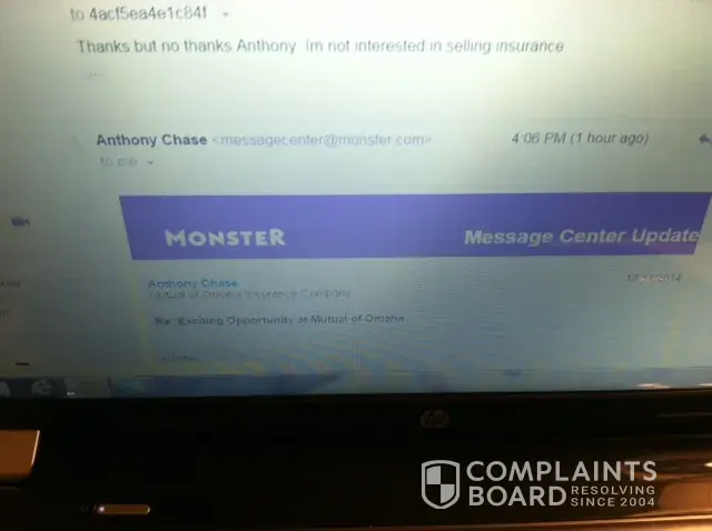 I was contacted by Anthony Chase from Mutual of Omaha and he wanted me to schedule an interview. I emailed Thanks but no thanks I am not interested in selling insurance. He sent this email Attaching to file He wanted to insult belittle and humiliate me He wanted to depreciate slight shame me and show me up criticize and belittle for his satisfaction and failure
