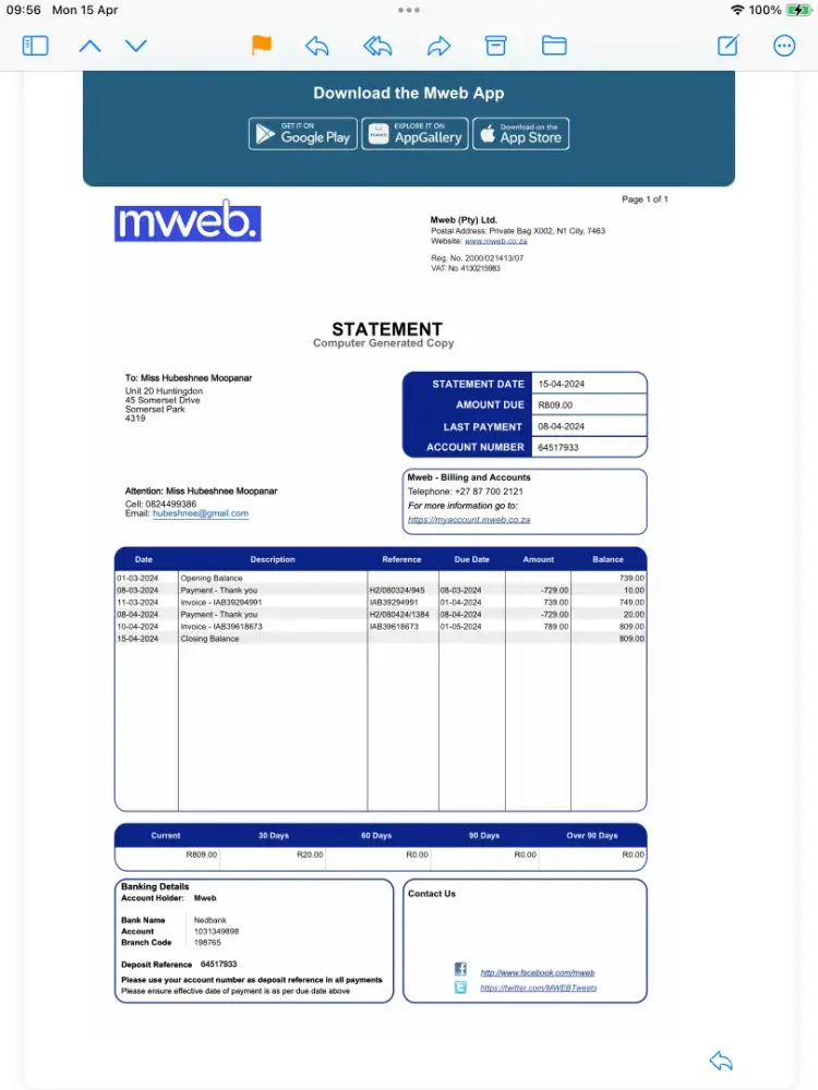I signed up with MWEB for their LTE internet. Part of my package was a free to use router. Due to poor service from MWEB, not getting the line spped which I was being billed for and Mweb's ever increasing price increases, I cancelled my LTE service. I then sent the free to use router on 25/03/2025, via Postnet, back to MWEB, to the company whose detail...