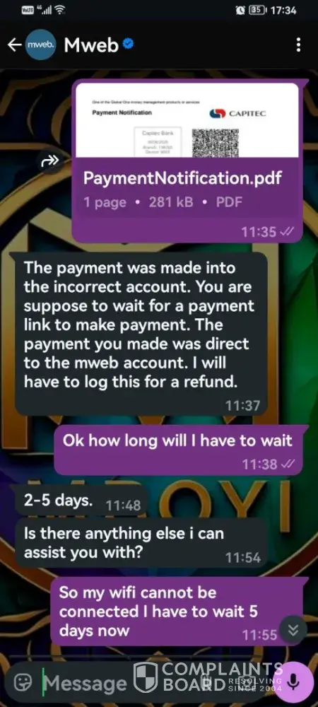 I am a customer of vumatel fiber and do payment via mweb. On 30th June 2025 I made payment of R439 to mweb and later on when I did enquiries the agent informed me that I made payment into mwebs direct account and that they will refund the money within 5-10 days but I haven't received my money or heard from mweb. I have been trying to contact mweb by...