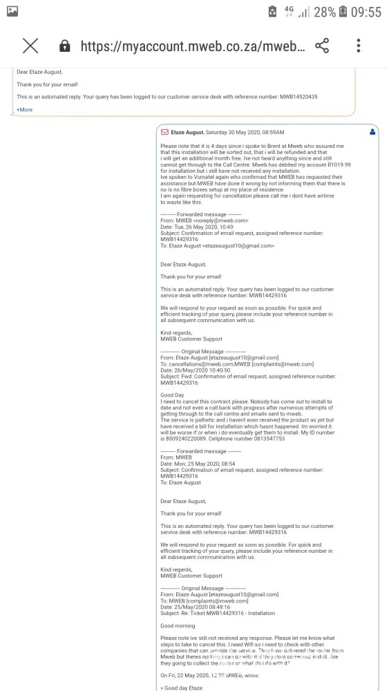Ive taken a fibre package with MWEB the 1st of April 2020 they told me it would take 2 weeks for installation which till today the 1s of June hasnt happened. Ive called the call centre after 2 weeks of signing up but cannot get through to the call centre. I then decided to call Vumatel who does the installation for mweb and they told me that the installation had taken place last year way before i moved into the property so mweb needs to issue a new ticket. I tried Mweb again but no success emailed them with no feedback. I then sent a msg to Mweb on facebook for cancellation. Called the mweb technical support line who managed to put me through to cancellations. The operator logged a call on the system and got their sales guy Brent to call me back. Brent assured me that i would get a refund and an additional month for free on top of the 2 free months owing to me. Today it is 4 days later, nobodys called me back and they have debited me R1019.99 for installation which has not taken place. Again, i cannot get through to Mweb to rather cancel this product and give me money back as i have not received their product. I called Vumatel again and theyr telling me the same thing. That MWEB needs to log a ticket with them informing that there is no installation on this property. I cannot understand why the would charge me R1019.99 for installation which according to Vumatel has been done way before i signed up for the product. My id is [protected] and cell number [protected].