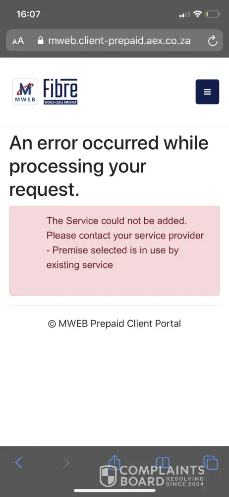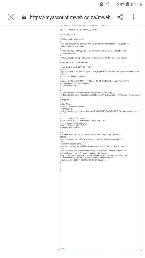 MWEB.co.za Fiber complaint - nobody to reach
