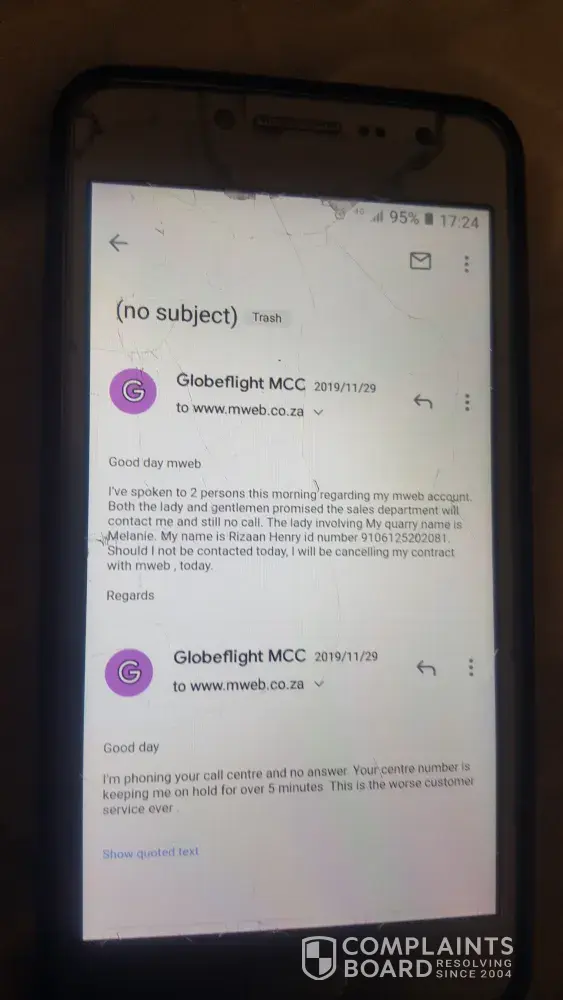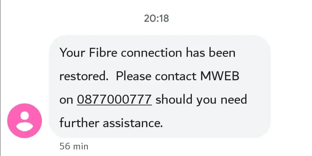 No service from day of fibre installation. Nobody responds to let me know the status of my query. Mweb debited my account for the full month plus rata when I never received service at all... daylight robbery! Pathectic service. I want to cancel with mweb due to breach of contract, no service. Logged a query and nobody responds.