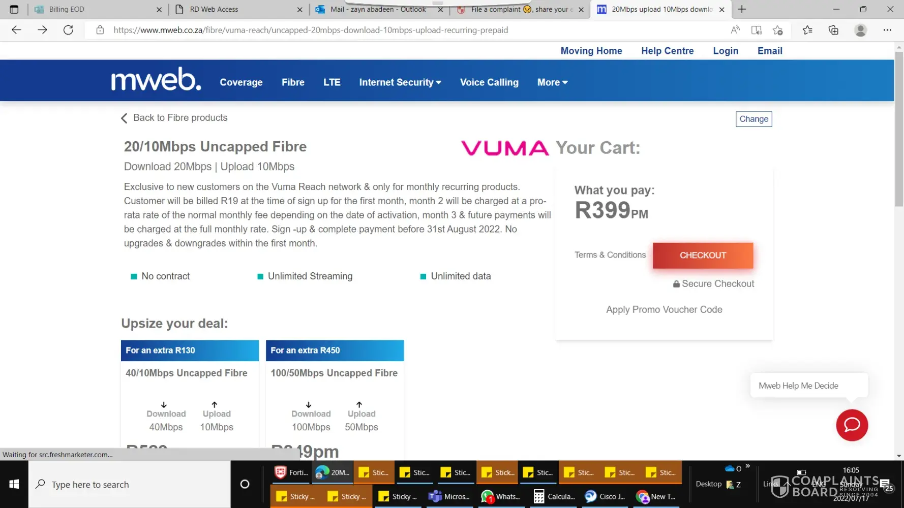 I first chose mweb with vumatel had contant disconnects where I had to phone mweb and go through the onoying voice prompts at least once a week just to get the same tier 1 troubleshooting then after paying them 750 to come fix the connection o still had constant disconnections. They then switched me from vumatel to openserve and today again I cannot use it because there is no internet accept mweb site that i can access. Im phoning axxess or vox in the morning mweb will never see me again nor will I recommend mweb to anyone