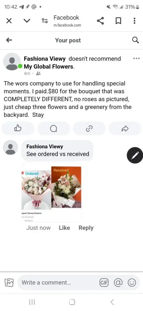 Terrible Experience with My Global Flowers: Late Delivery and Wrong Order, No Refund