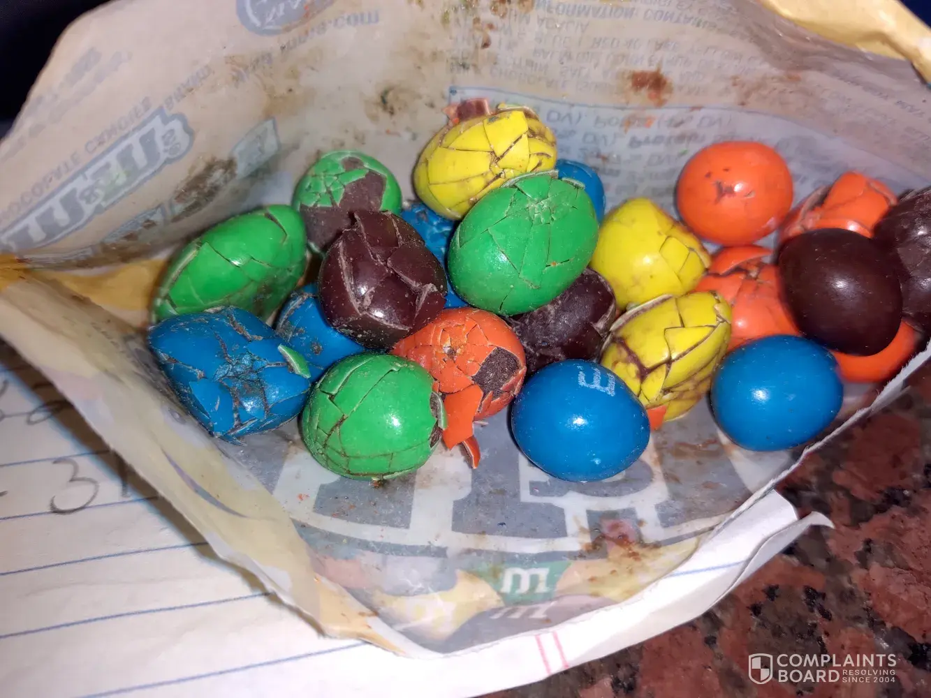 The bag of M&M's we just purchased was just crumbs. Everything was broken. We've had another bag like this before. Even the coating feels different. We always buy the party size . I've taken a photo and have attached it so you have the information. I've worked in a food manufacturing place before, so I know you'd like to know about this! We consume these on a regular basis, so we know the product WELL! ðŸ˜