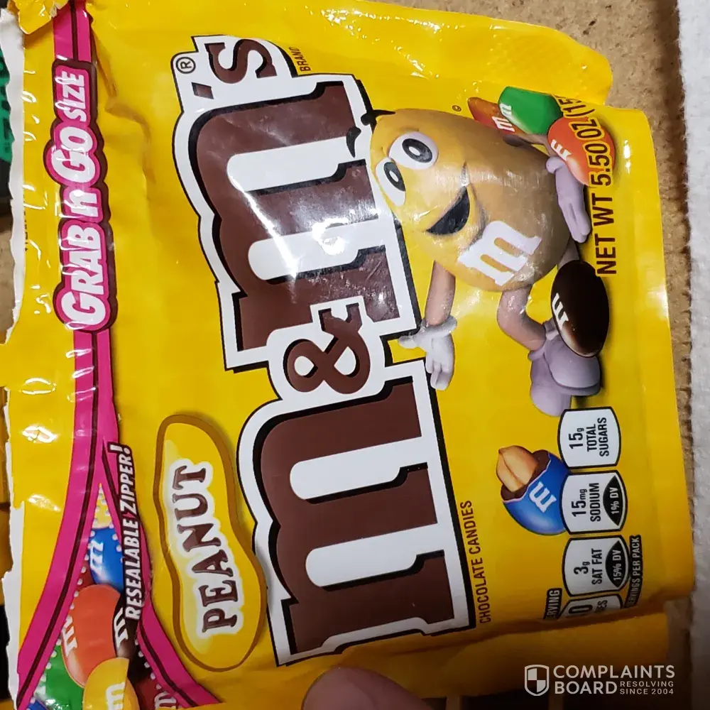 On 9/17/2019 I purchased a 1.74 oz bag of peanut M&M's from our office vending machine and when I opened the package the candy inside looked like someone had stomped on the package. They were crushed. I have included a photo. So disappointing. I threw them in the trash. Needless to say, I was shocked by the quality of this product. Please check on this. The numbers by the date on the package look worn. This is concerning as well. I am seeking a refund of $1.00.