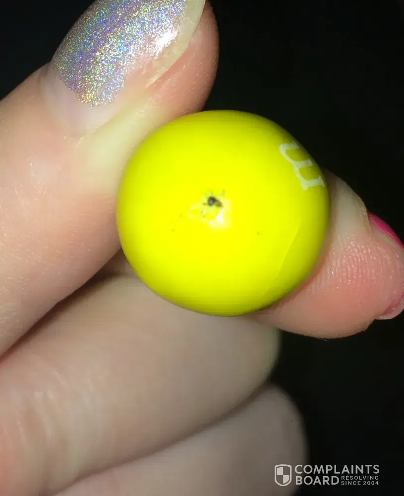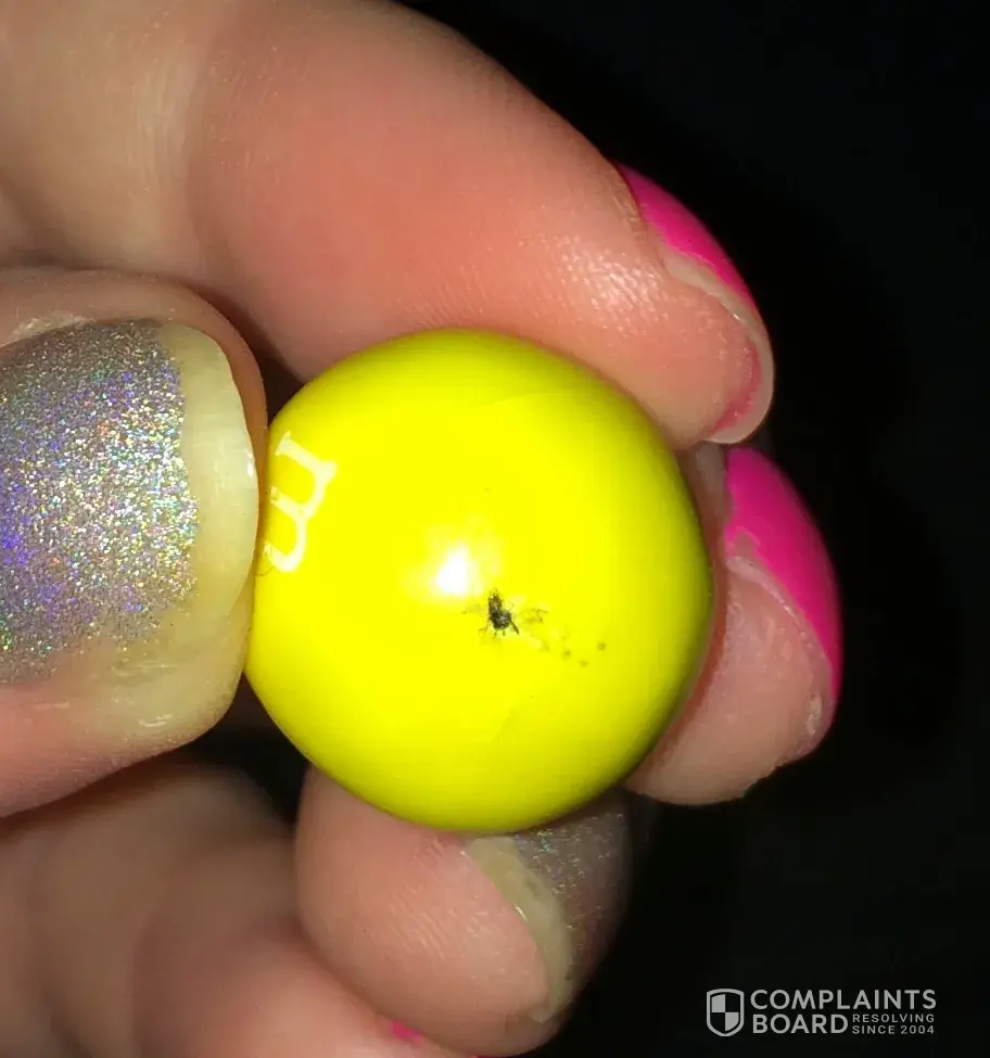 I was enjoying my m&m's when suddenly I noticed a black spot on one of them. When I investigated further I came to realise it was a small fly, squashed into the sweet. I felt ill after seeing this and was very unhappy and unable to enjoy the rest of the sweets. I have attached photos down below.