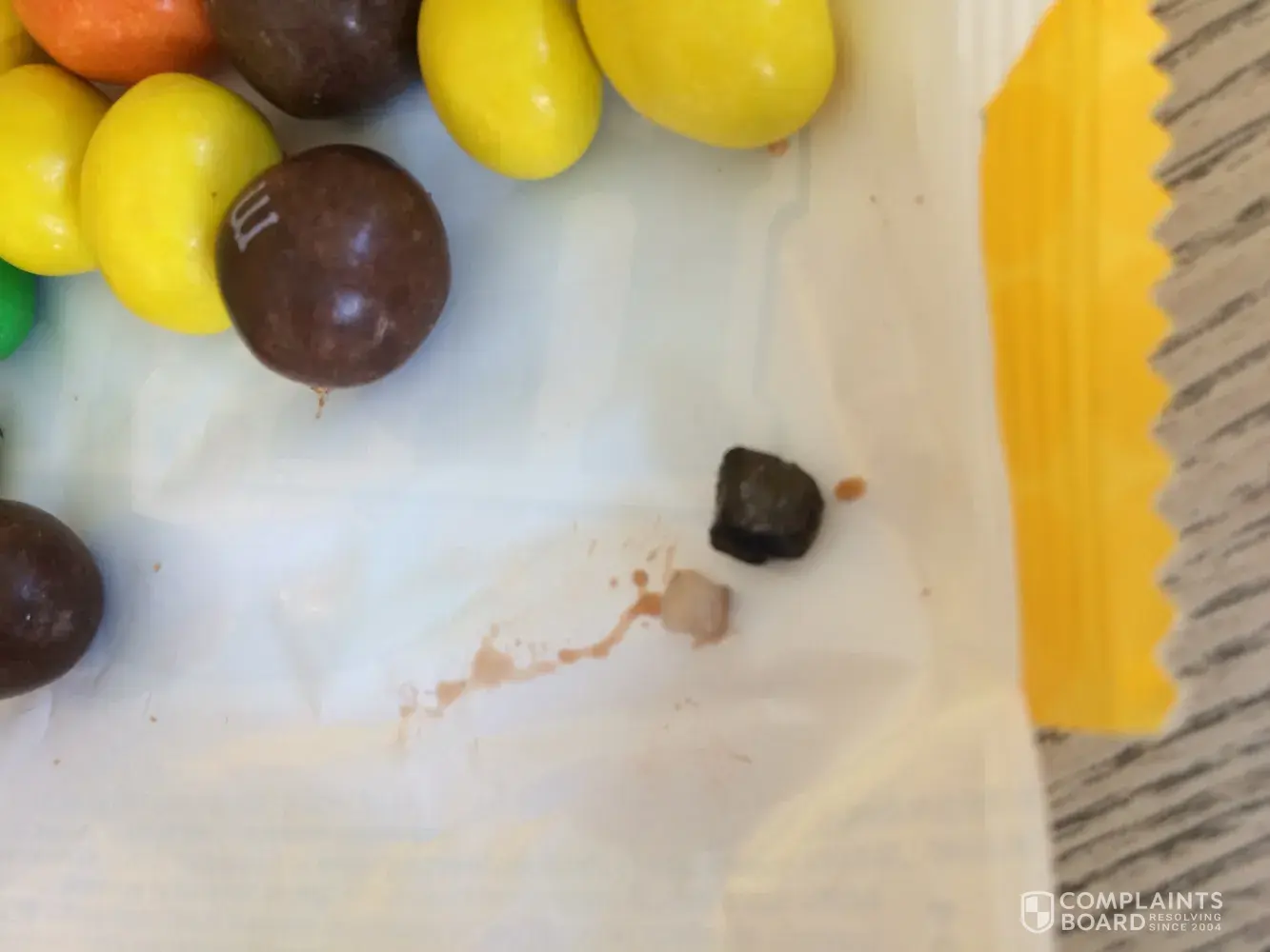I bit Into one of the choclate peanuts and almost broke my tooth on the product in the middle it seemed slightly darker than a regular peanut I have taken images. Not only did i almost break my tooth but a small piece has got wedged inbetween my 2 back teeth and I am now in agony! This is a real nuisance and also very dangerous. I am usually a big fan of this product and am very dissapointed I hope this can be dealt with efficiently and to a satisfying standard.