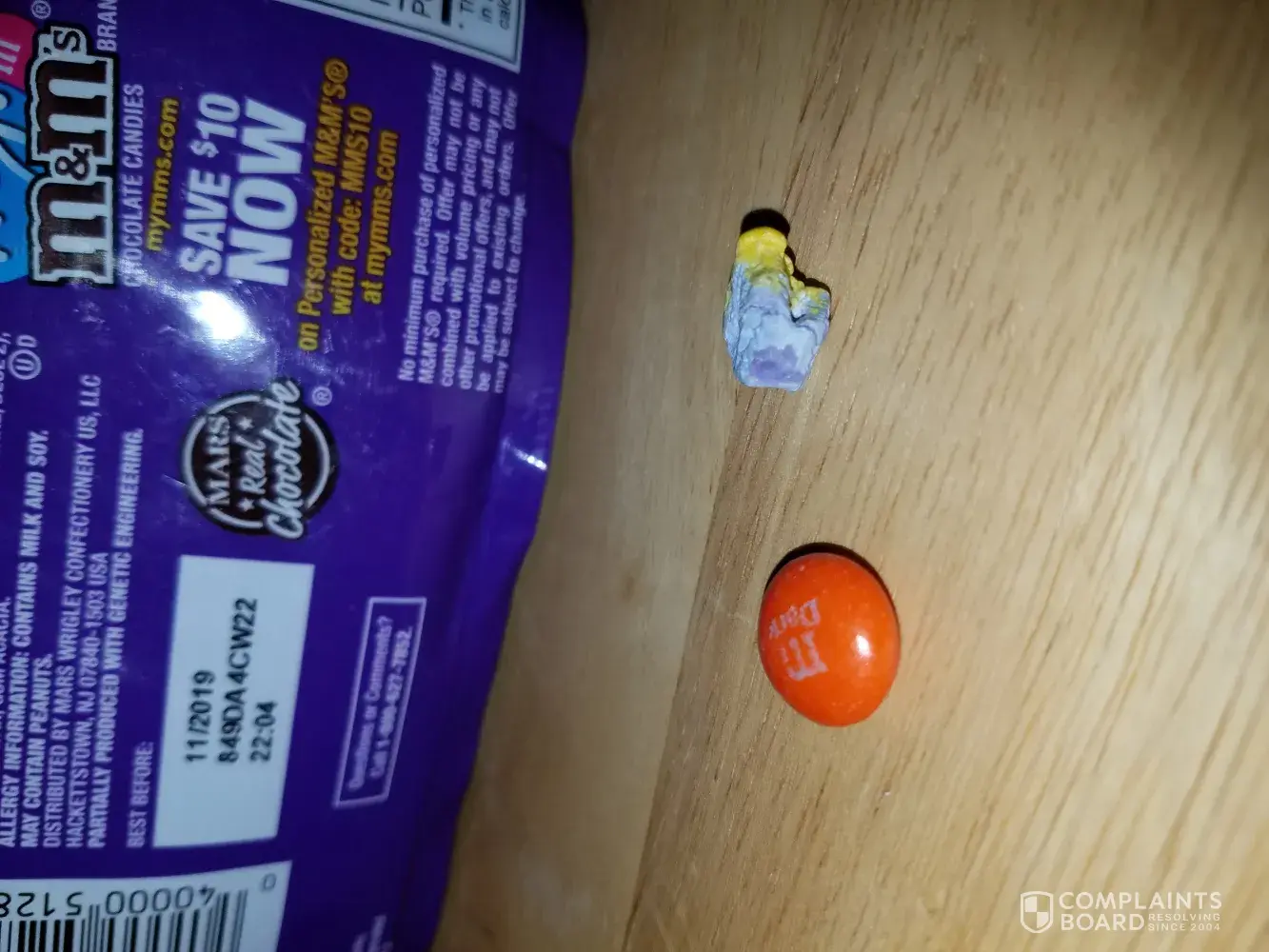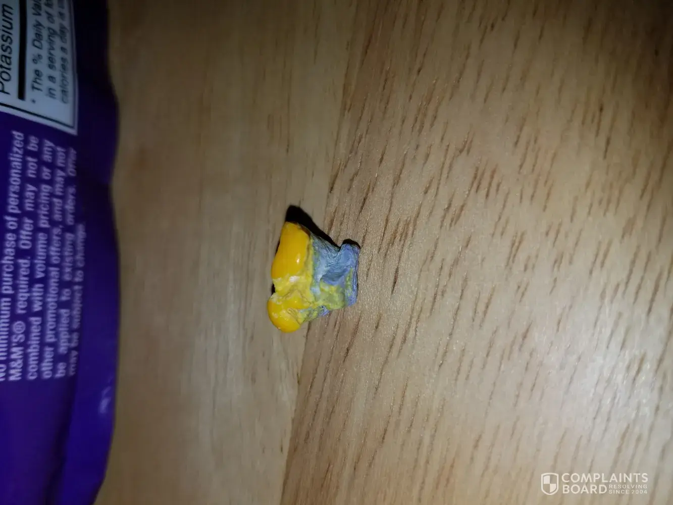 Found this yellow/ gray chunk in the bag of M&Ms I was about to eat. Upon Closer observation, it is definitely metal with yellow paint on 1 side. Hard as a rock. Look at pictures below for metal piece and the lot number. I am Not going to eat anything from this bag so please refund me. Look at your manufacturing equipment for other faults & recall this lot asap before someone chokes or breakes their teeth. Please respond with a resolution.
