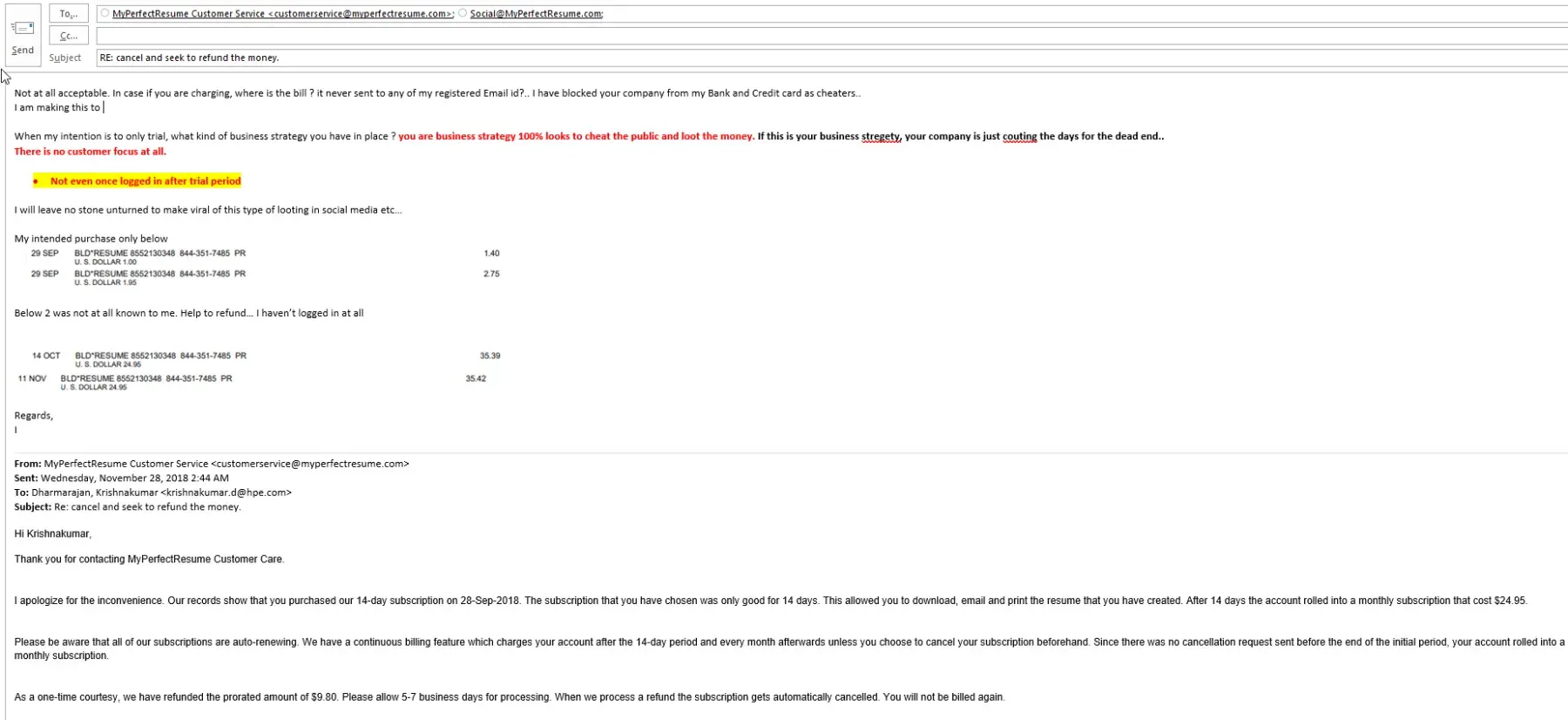 Did this happen to you, too? It happened to me (I have all the emails to prove it), and from what I've seen online I'm sure it has happened to many, many other victims. My Perfect Resume is actually The Perfect Scam and deserves the Mother of all Class-Action Suits. People, it's time to rise up and shine the light of truth on these cockroaches.