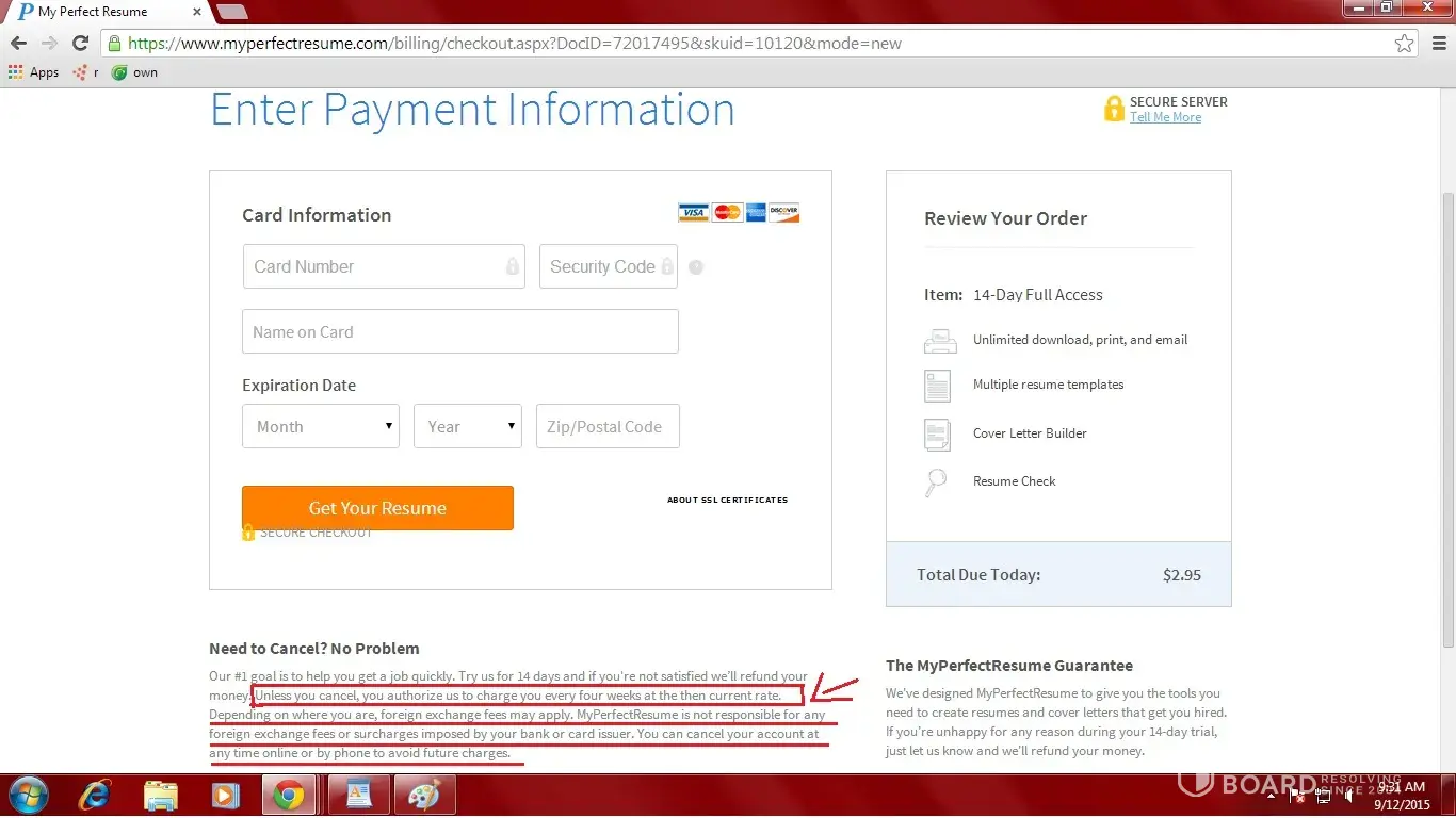 What every you do, DO NOT use my perfect resume... They are not clear on the service they provide at all. They make it seem that you pay a one time fee which is minimal $2.95 to create a resume... this seems ok so yes I will pay that... until one month later they hit you with a $50.49 charge which apparently is a subscription I signed up for! What an absolute joke! Who the hell in their right mind would use a service like this... Don't be fooled by the very cleaver and sleekide set up this company has running! If you are not wanting to spend $50.49 a month to create what you believe is a one time fee of $2.95 just stay well away from this website all together.