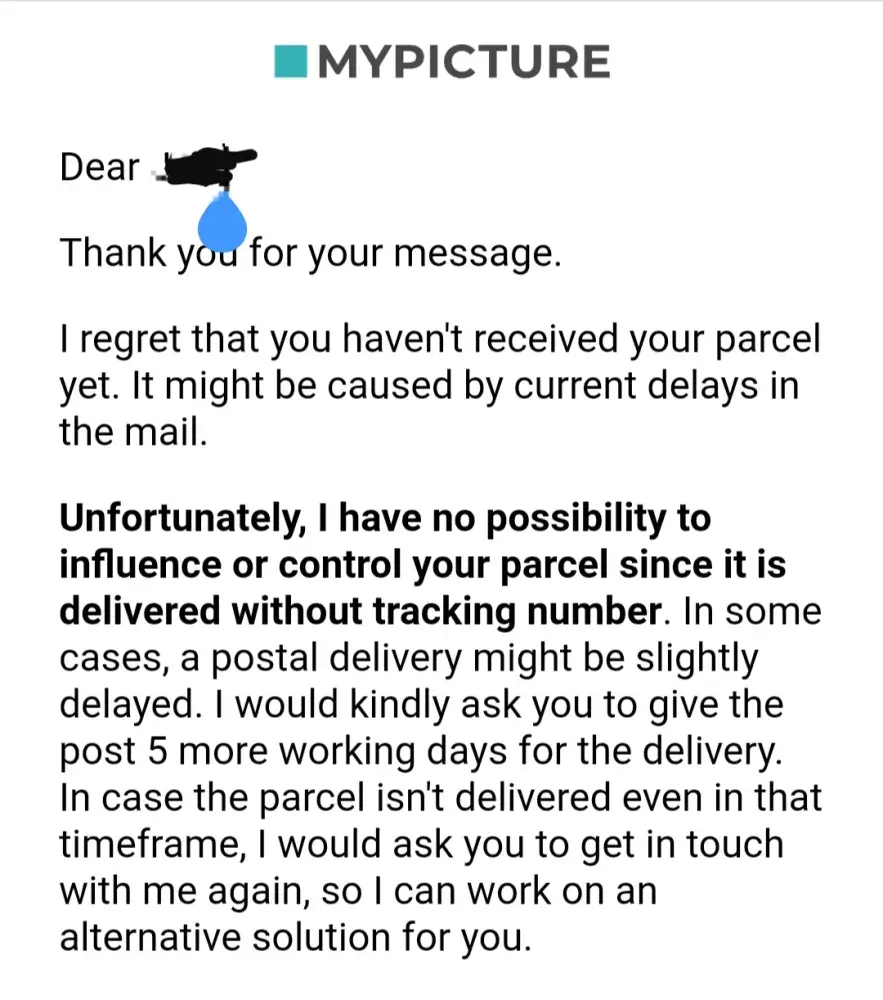 order number UKA39904484704 website quotes 3-8 days delivery ordered 174 photo prints for a friend's 50th birthday celebrations. ordered 13th November, arrived 4th December - 21 days, totally missing the event for which they were ordered no postal tracking so no idea when they were going to arrive refused to give refund as they were not fit for purpose once order was outside of delivery window (3 to 8 days), I contacted My-Picture who replied with: "Unfortunately, I have no possibility to influence or control postal deliveries without tracking. In some cases, a postal delivery might be slightly delayed. I would kindly ask you to give the post 3 more working days for the delivery. In case the parcel isn't delivered even in that timeframe, I would ask you to get in touch with me again, so I can work on an alternative solution for you." I since contacted them again and again but had absolutely no response until the photos finally arrived 3 weeks/21 days after ordering. This response came 3 days after I emailed saying they'd arrived and requested a refund as they were no longer fit for purpose due to the time it has taken for delivery. The response stated that they wouldn't refund.