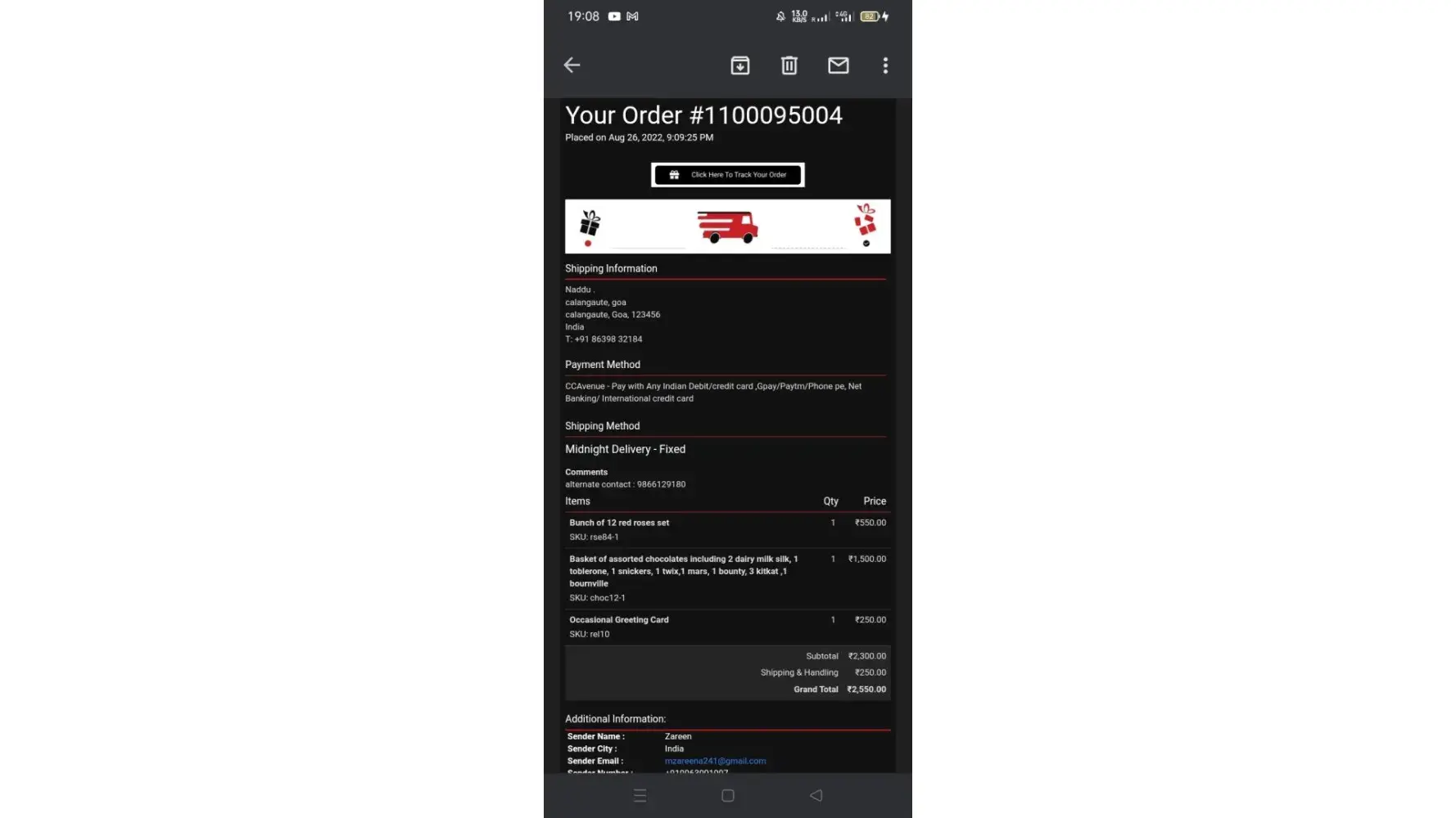 Then when I asked the chat window about the fixed time delivery, I was told there is no such thing! But the option exists in the myflowergift website which is USD 3.6 or INR 200. I clicked the option and the pricing immediately recorded this INR 200 amount to the total bill. If there is no fixed time delivery, why keep the option which records the selection and adds in the bill once you click it? I can only assume the INR 200 that shows in the receipt is the fixed delivery time cost which registers as shipping. Curioser and curioser!