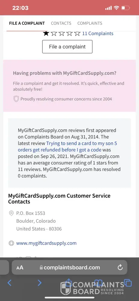 Our conclusion: ComplaintsBoard's review suggests MyGiftCardSupply.com is generally legitimate and safe for transactions. However, with a resolved complaints rating of 0% we recommend that you stay careful. Before interacting with MyGiftCardSupply.com, take the time to review customer feedback and the approach to resolving complaints.