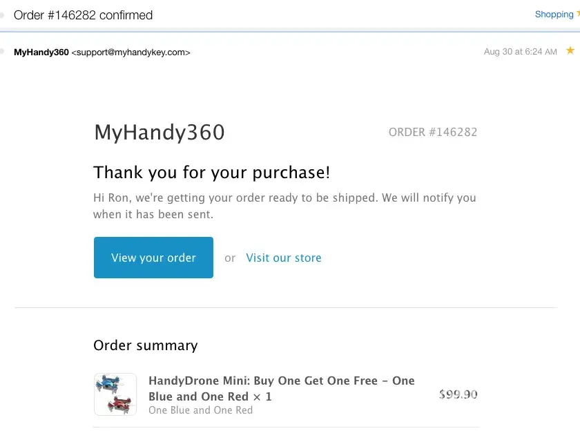 Just received the email from MyHandy360; can't fulfill order take it up with PayPal or Credit Card Company. Apparently they are in Australia. Plenty of people scammed as they advertised heavily on Facebook. At least FB closed their page, or MyHandy360 blocked me. Whatever. I've filed with PayPal sending them copies of emails they sent and I sent. It's only $70 bucks but it's more about principle now than the money.