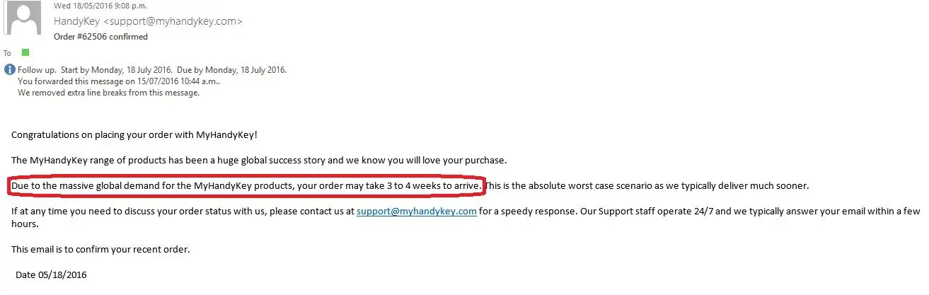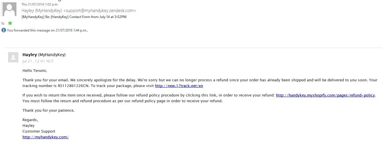 I have ordered this 'handykey' when I saw it via Facebook and order processing was so easy and got the confirmation stating it will take 3-4 weeks. It set our expectation with long lead time and I fear many consumers forget about it as some tend to order often via online. I did not hear from them at all even waited 2 months so I sent an inquiry to the company via their website 'contact us' but no reply. I called my New Zealand bank to dispute it and the bank at first said it might be difficult as it's over 60 days (2 months). But I explained about the company stating lead time of 4 weeks and I have waited patiently another 4 weeks and then found many complaints online. The bank took this seriously and disputed. That was around 15th of July. Today on the 21st of July, I received the e-mail enclosed saying they can't refund as the product was just shipped! It's so dishonest as they took action to fulfill the order when they got dispute of payment. What a scam! Please make a dispute with your credit card company and don't give up, please.