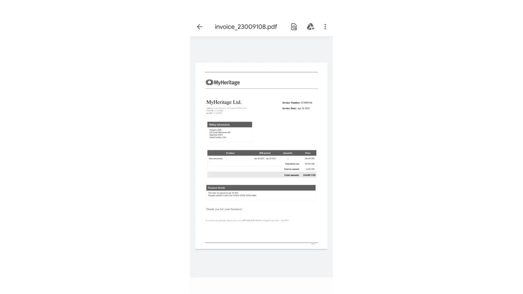 I have phoned My Heritage, but only an automated voice response, then they promised to call me back, but it never happened.