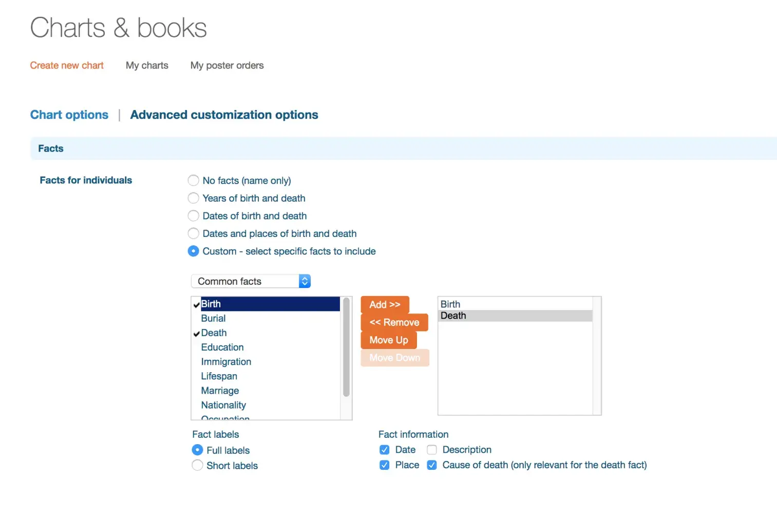 On your advanced customisation options on Ancestors, Charts and Books, the Facts for individuals section has a few buttons that don't work. When you select a common fact and try to add it to the rest, the buttons 'add', 'remove', 'move up' and 'move down' don't work. Can you please advise me on how to get these functions operating.
