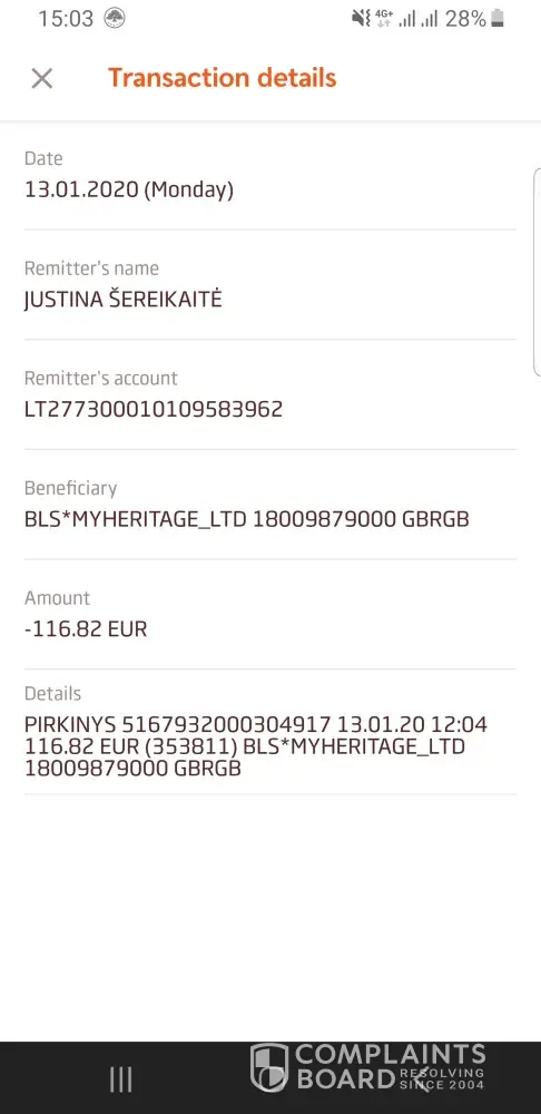 BLS*MYHERITAGE_LTD Na kwotÄ™ -121.77 EUR