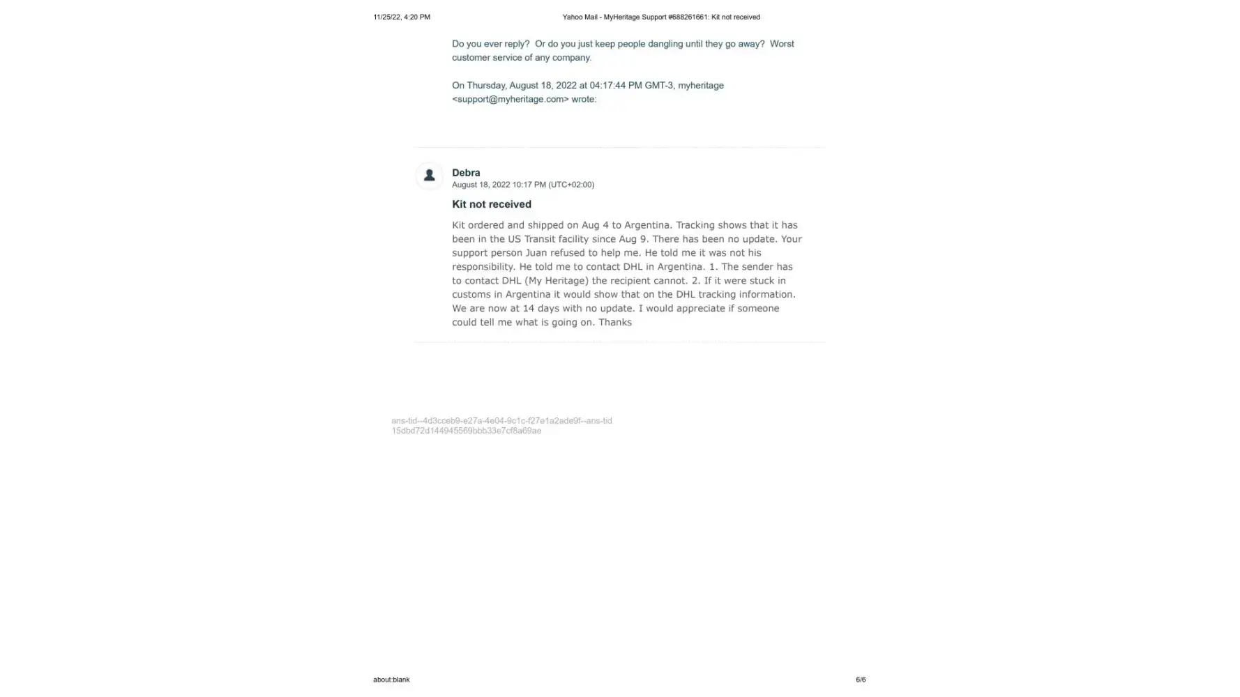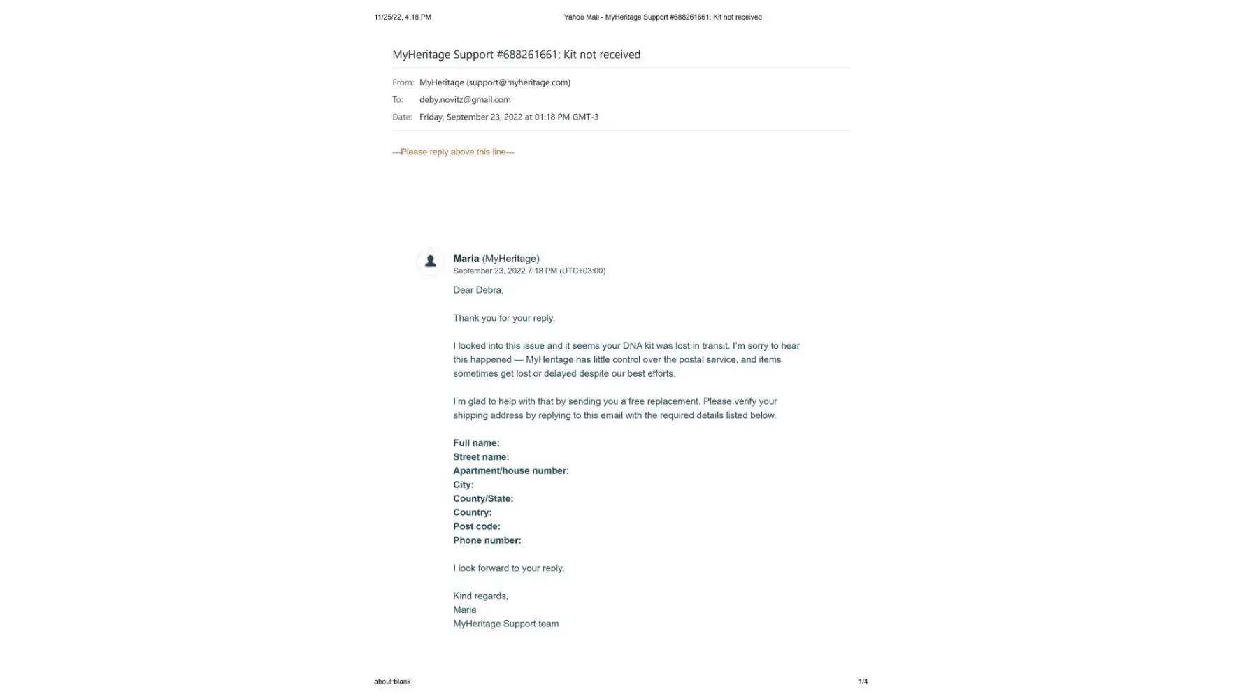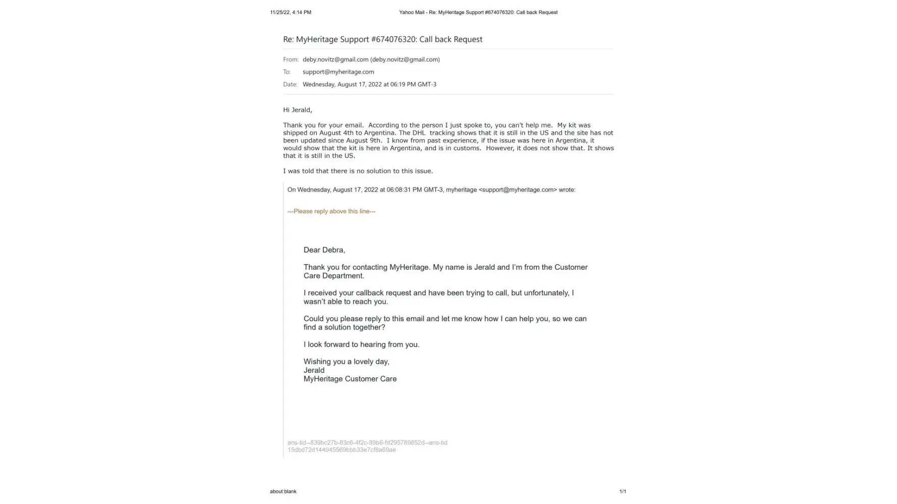 On November 15, Maria then wrote me that she was going to pass my issue on to their DNA team and they would contact me right away. I am still waiting. It's been 10 days.