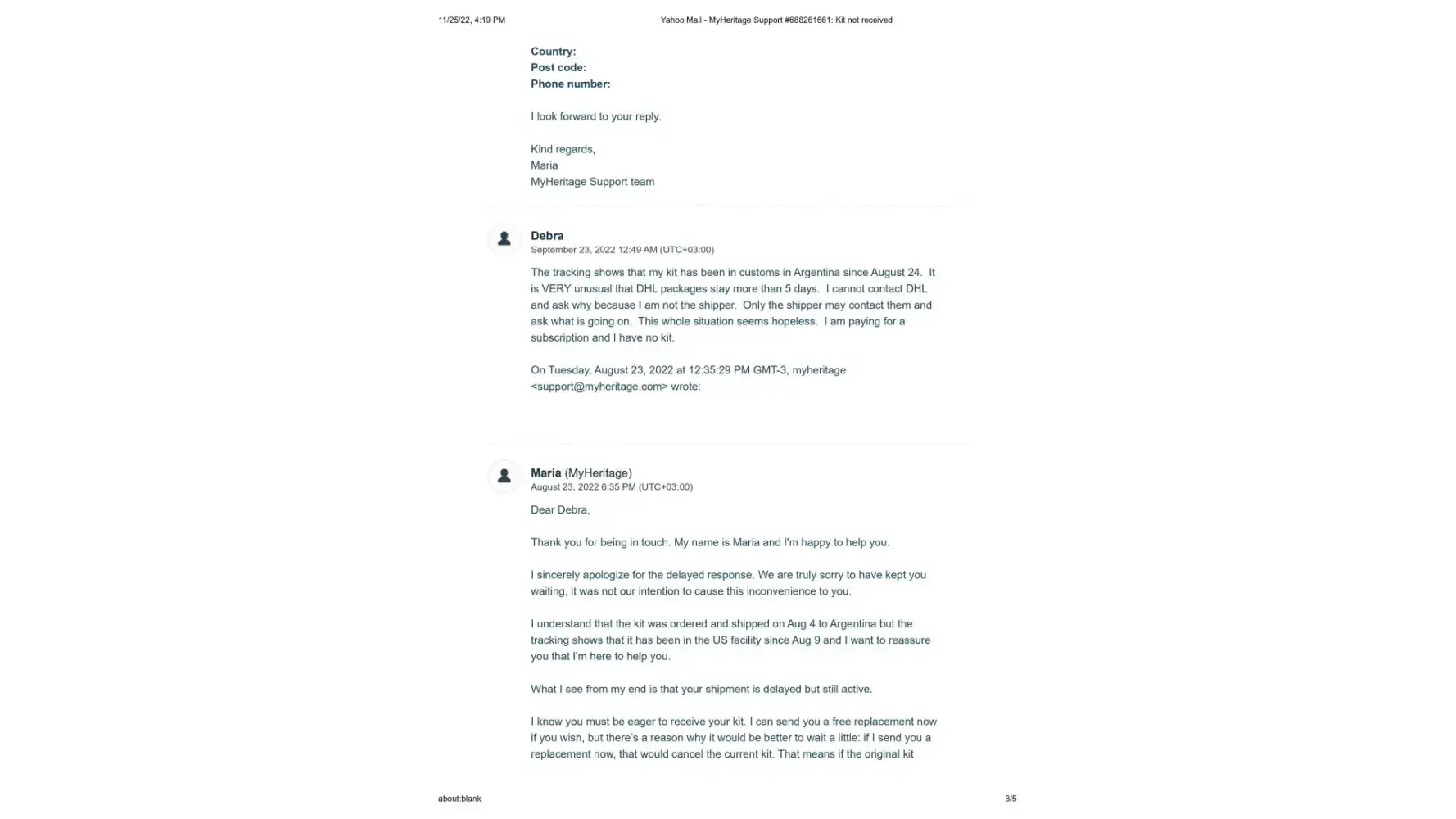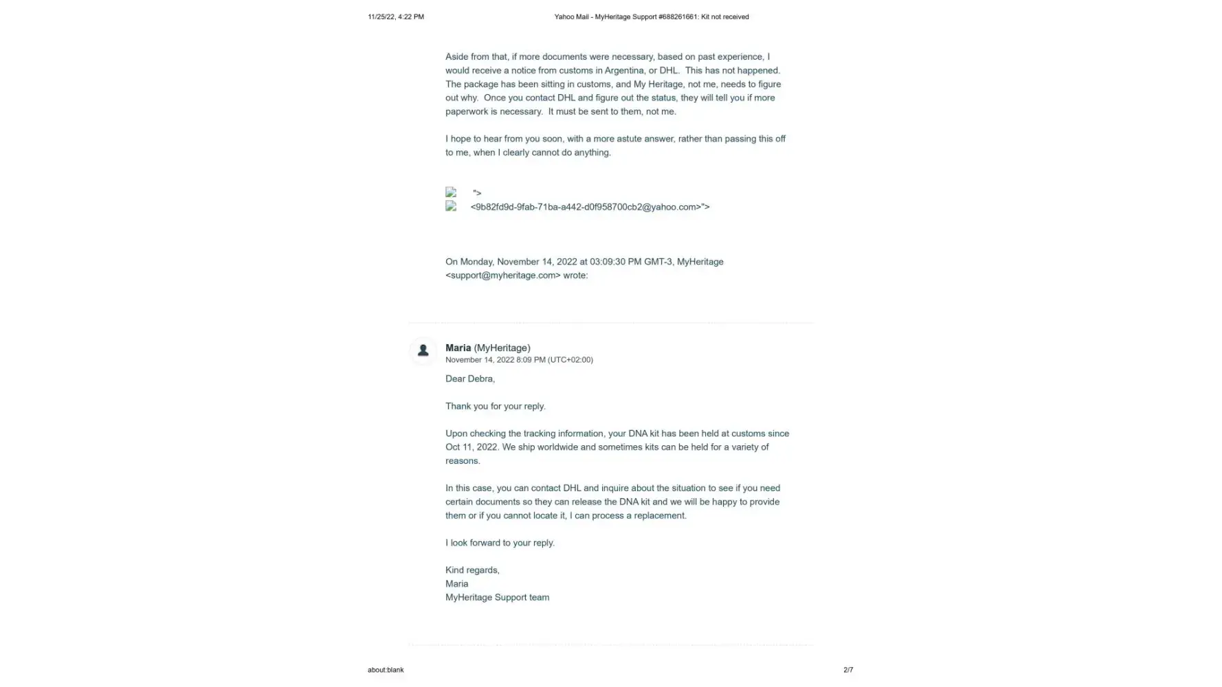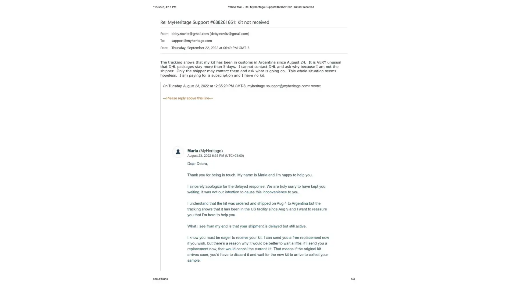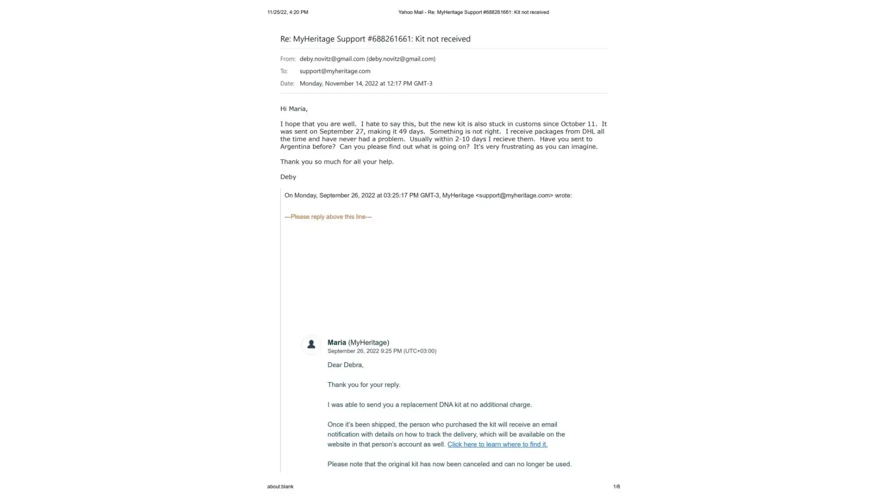 It's now November 25, 2022, 2 months since the new kit was sent, and I have still not received it. I contacted Maria once again on November 14, 2022 to let her know that the kit shows it is still in customs since October 11. (This is exactly what happened with the first kit) Her response once again was to tell me to contact DHL personally, and that sometimes there is a need for some additional documentes that they would be happy to send me. I sent Maria the cut and pastes from the DHL website where it explicitly states that the shipper must contact DHL and that if more documents are needed DHL will make contact. This also has not happened.