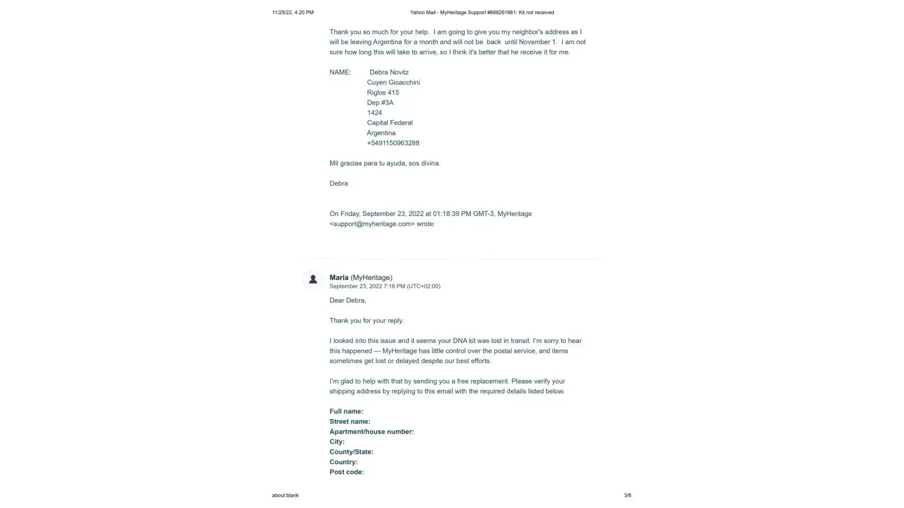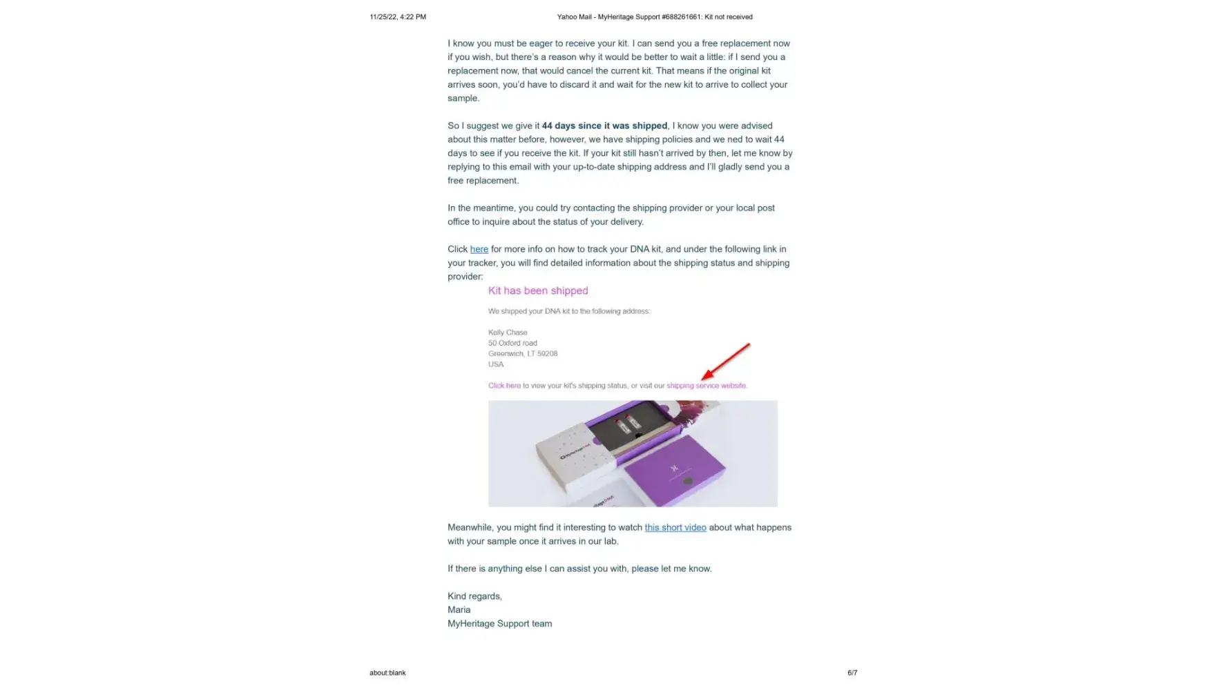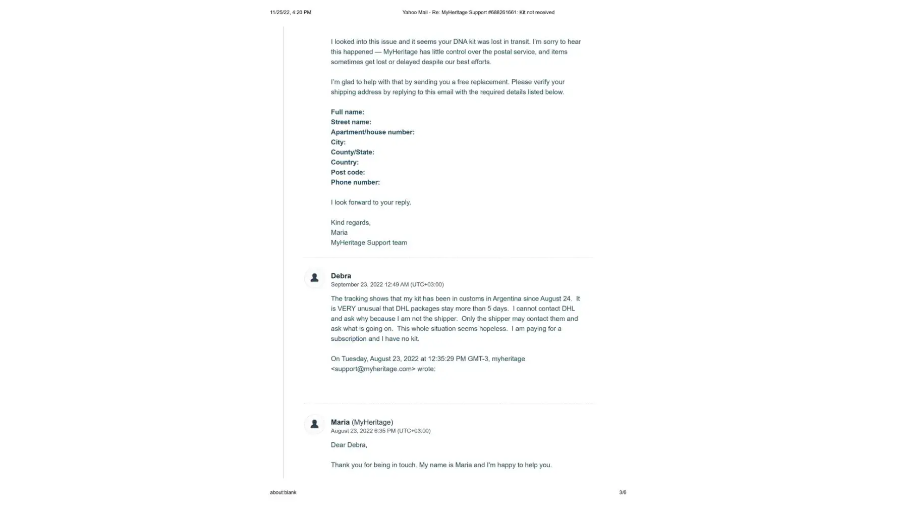 It's now November 25, 2022, 2 months since the new kit was sent, and I have still not received it. I contacted Maria once again on November 14, 2022 to let her know that the kit shows it is still in customs since October 11. (This is exactly what happened with the first kit) Her response once again was to tell me to contact DHL personally, and that sometimes there is a need for some additional documentes that they would be happy to send me. I sent Maria the cut and pastes from the DHL website where it explicitly states that the shipper must contact DHL and that if more documents are needed DHL will make contact. This also has not happened.