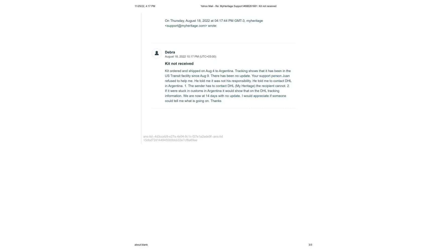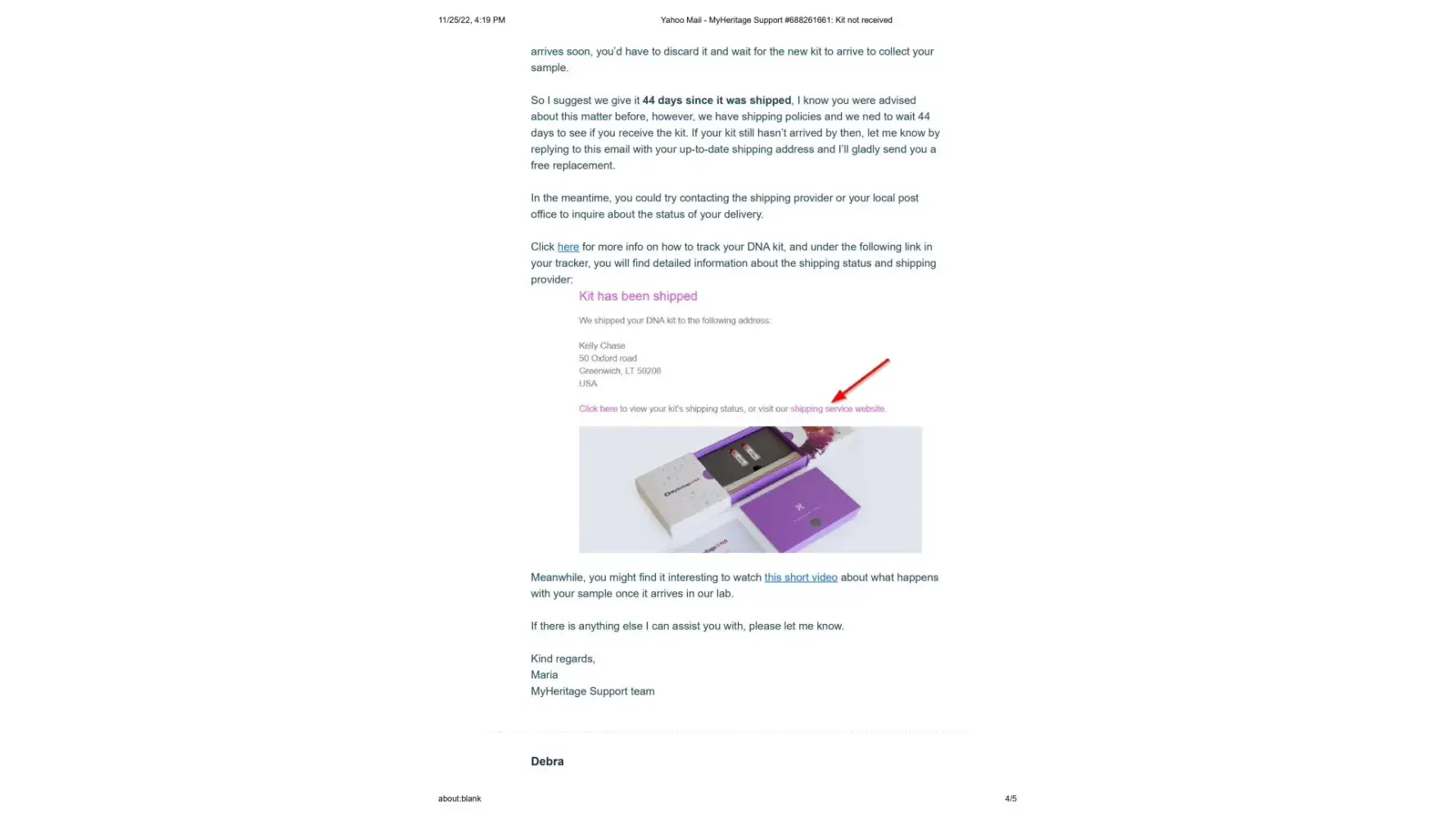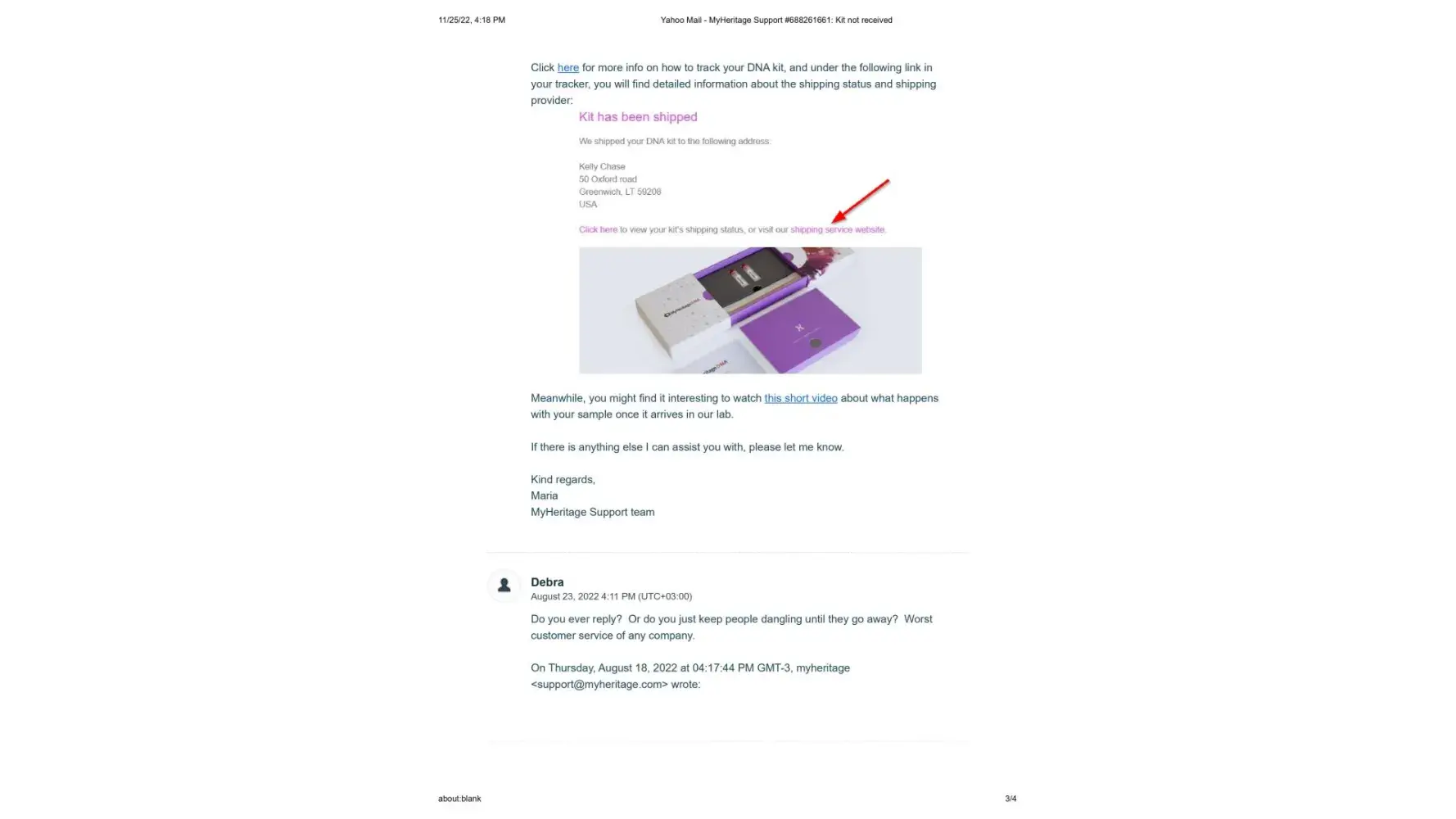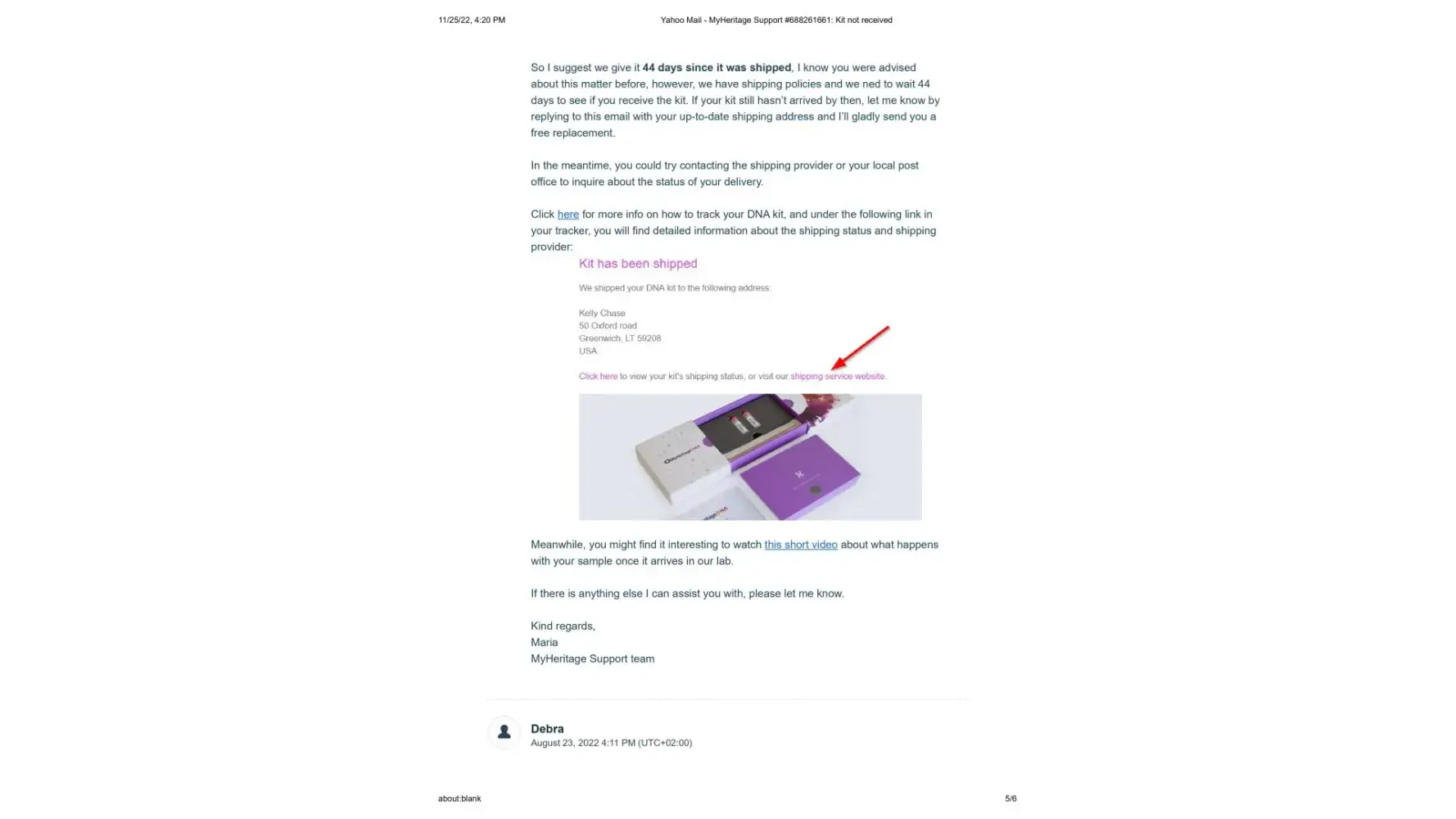 It's now November 25, 2022, 2 months since the new kit was sent, and I have still not received it. I contacted Maria once again on November 14, 2022 to let her know that the kit shows it is still in customs since October 11. (This is exactly what happened with the first kit) Her response once again was to tell me to contact DHL personally, and that sometimes there is a need for some additional documentes that they would be happy to send me. I sent Maria the cut and pastes from the DHL website where it explicitly states that the shipper must contact DHL and that if more documents are needed DHL will make contact. This also has not happened.