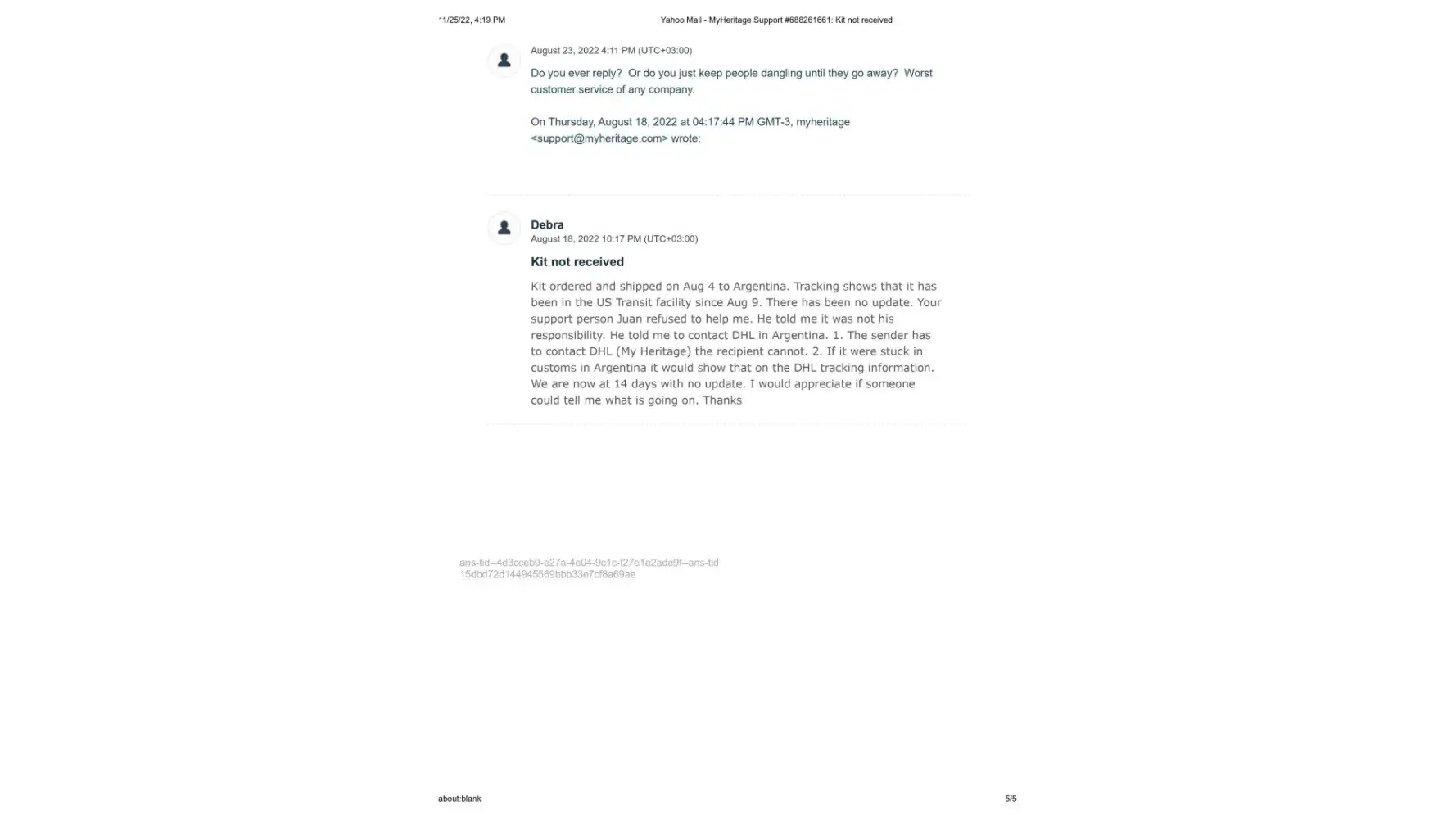 I purchase my kit on August 4, 2022. It was shipped but did not take the 12 days promised. It stayed stuck in Argentine customs according to the tracking. I tried contacting support to find out the disposition. I contacted them August 14,15, 17. When I spoke with Juan on August 19, I was told to contact DHL and see why. I informed Juan that the shipper must contact DHL, they will not speak to me. He could offer no solution other than to wait 44 days. I then tried contacting them on Aug 23. A support person Maria, sent me an email. On Sept 23 she reiterated everything she already told me including that I should contact DHL. Once again I had to explain why I could not do this. Finally, on September 25, 2022 she informed me that my kit had been lost (!) and they were sending a new one.