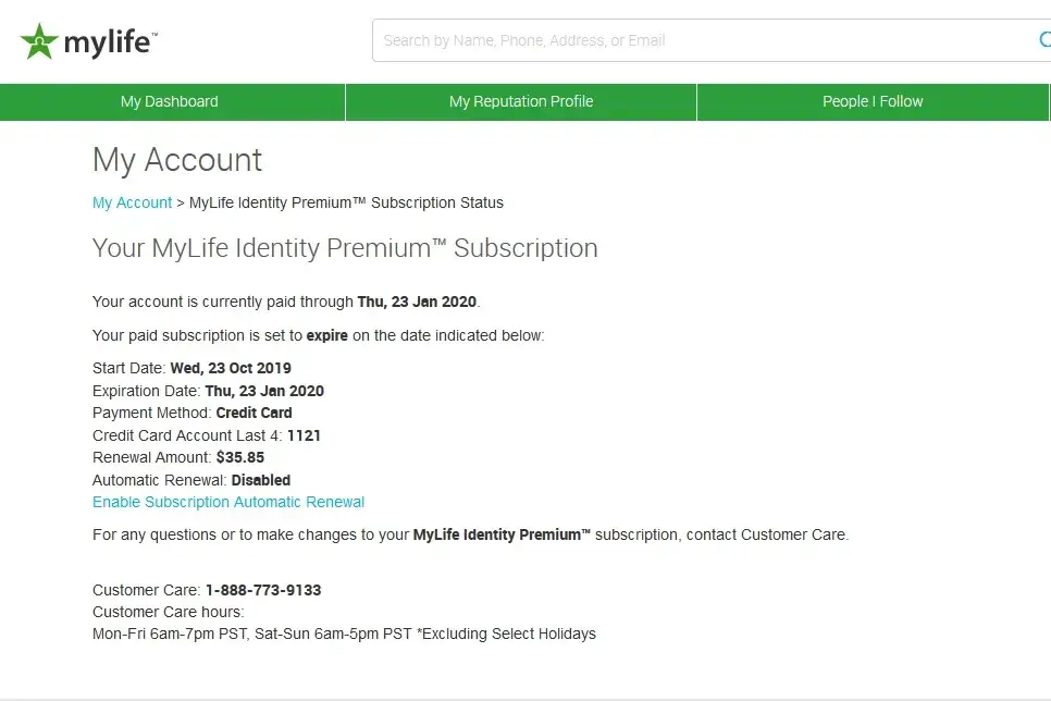 They cheated and leaded you to purchase. And I have experienced and I think is a scam. After several months unhappy non-sense wasting time. I membership got really cancelled. But later on again, they still put my name under MYLIFE.com and posted my information under their name.