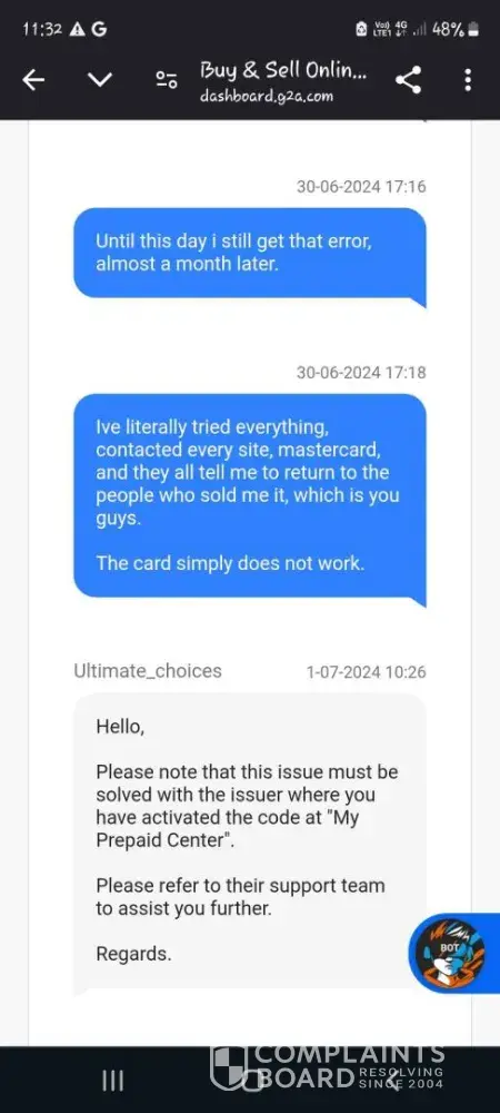 Hello Marco, thank you for contacting Myprepaidcenter.com. We apologize that you weren't able to use your card. We have contacted you via complaints board DM to learn more about your experience.