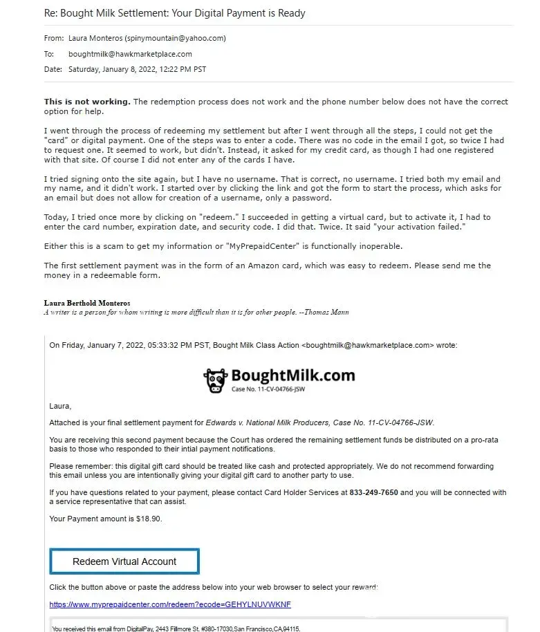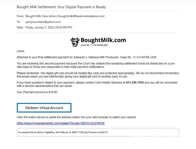 Hello, we are DigitalPay, the payment service provider for the BoughtMilk settlement case. Please be assured payments are legitimate, not a scam.