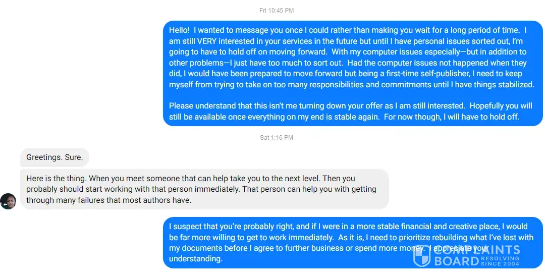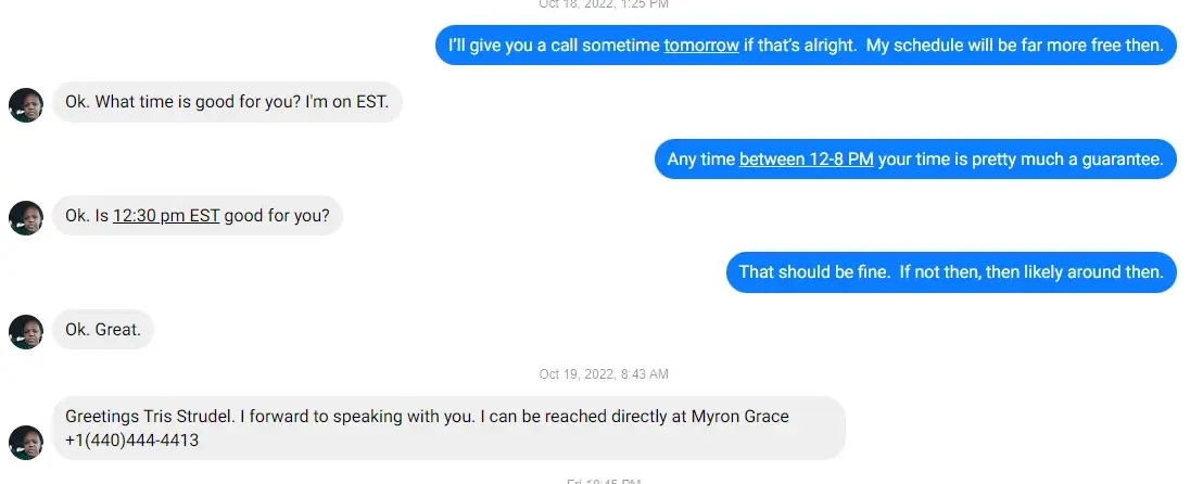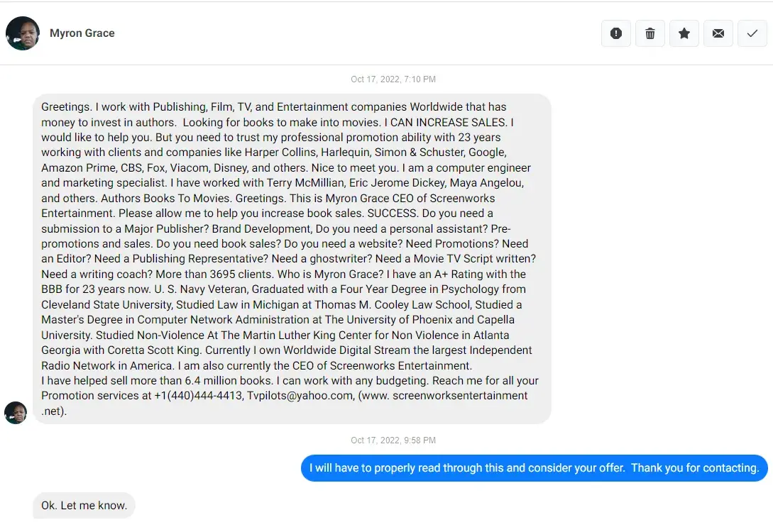 I was recently contacted by an individual named Myron Grace who advertised his services for new authors. This ranged from movie deals to advertisement and more (See “Myron Grace 1.pngâ€). I was suspicious of his text wall of an offer from the start but I agreed to have a phone call with him to test the waters (See “Myron Grace 2.pngâ€). During this phone call, we discussed the premise of my book, Myron’s experience (which he talked about at length to attempt to impress me), and a few personal things. I informed him flatly that while I may be interested in doing business, I was not ready to commit to something this early because at the time, my computer had been mysteriously wiped and I was dealing with potential monetary issues. I did not wish to spend additional money hiring someone when I was consistently spending money on ads for my book already.