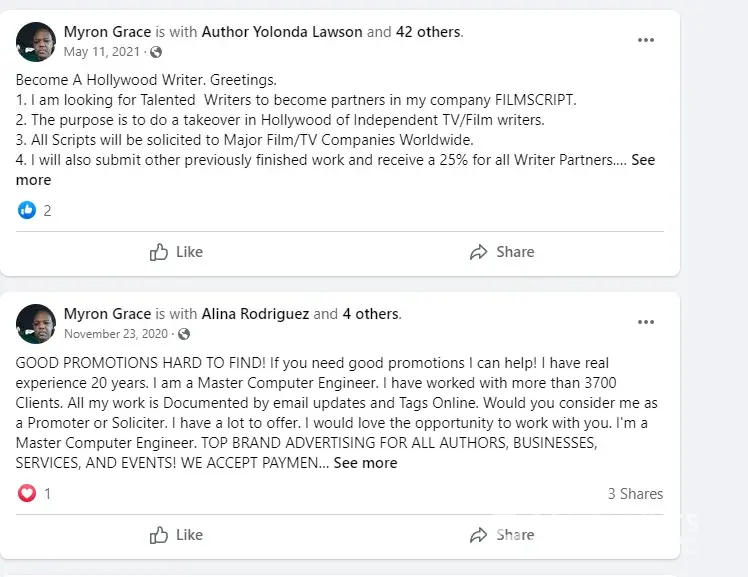 Myron Grace is an absolute scam artist. He was hired to do promotional work to promote my books and we spoke briefly about him seeking distribution for some of my television show ideas. He lied about having sold over millions of copies of books and essentially his marketing consisted of booking me on the same shell twice they had a very limited audience as well as sending email blast which were spam to people who didn’t want to receive them by copying and pasting my book description with little or no effort to introduce the contact or include photos or press releases or any of the information I provided for him. His emails and communication was riddled with typos and he even went so far as to send out a book blast with my name as the author of somebody else’s book. Things intensified when I told him I wanted to sever the agreement he became confrontational and started threatening me in my inbox on Facebook and when I blocked him on Facebook he then went to email and started threatening me. He also supposedly took some unauthorized trip that cost over $6000 and asked to be reimbursed for it. One of his last messages he even said something that indicated to me that I was absolutely right that he is completely insane and that is that he is related to the queen of England. The man is insane run like hell and do not have them promote anything for you I’m upset that I wasted $500 on his services! Here is a screenshot of the last insane message before I blocked him.