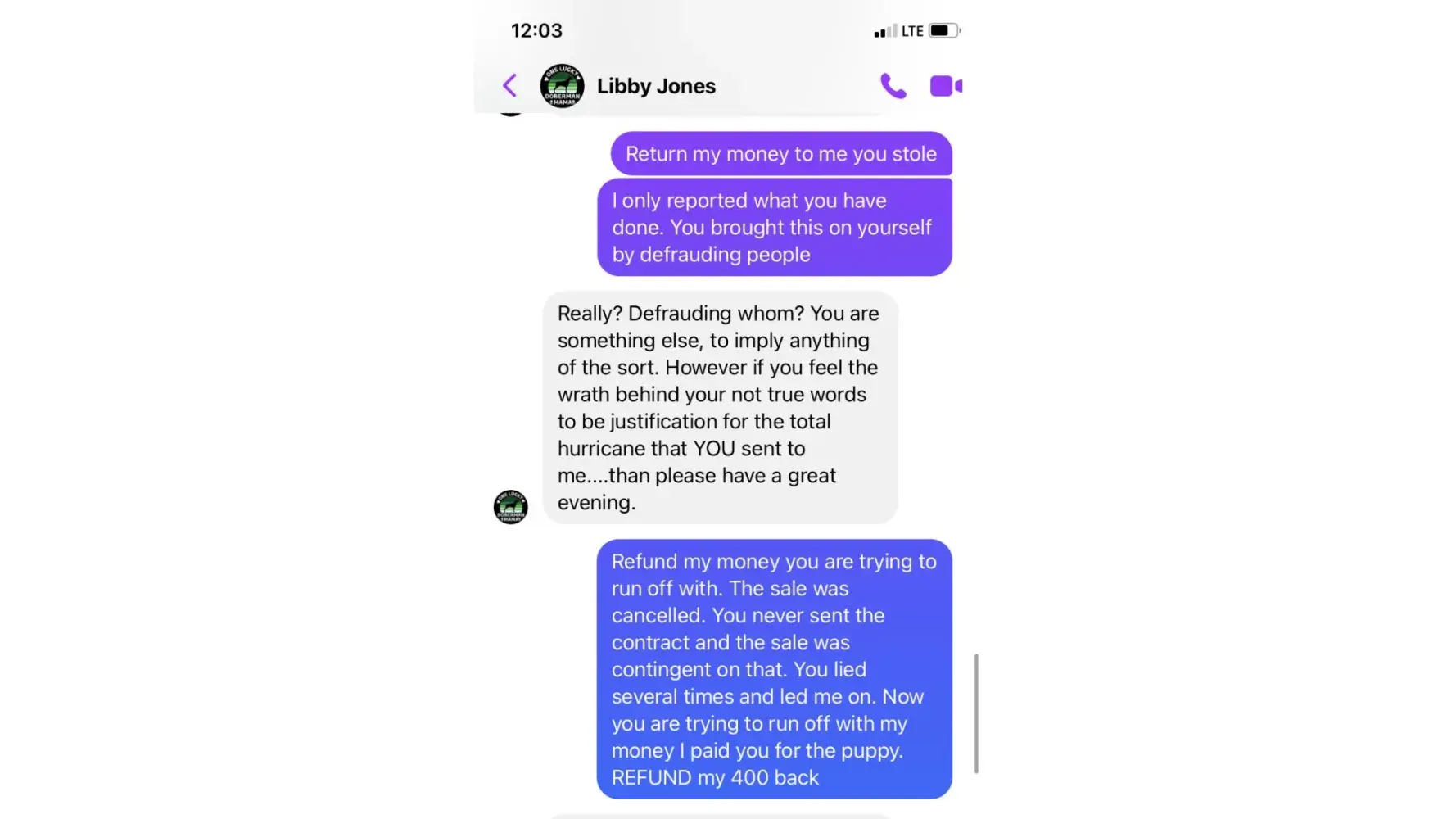 I am posting this to warn everyone to not do business with this woman. She is a scammer. On November 5th, I spoke with her over the phone for 2 hrs, asking anything and everything about testing, the health of her dogs, temperament, etc. I looked her up over the internet and could not find anything negative about her. So I sent her the $400.00 deposit for one of her puppies. I asked several times if she would send me the contract and health guarantee. She asked me for my information to fill in the contract so she could send it. She sent me an invoice for the deposit in Paypal and as soon as the deposit was sent she immediately transferred the funds into her bank account and stopped communicating. I thought it was odd, I didn't get the contract, but I figured she was exhausted from staying up with puppies all night so I gave her a couple of days...still nothing. So I sent her a message. She ignored my message. At this time I'm getting really worried. I had two of my friends contact her in which she actively engaged in conversation with them so I messaged her again. She finally answered and gave me some excuse saying her computer crashed that she had to have it fixed and would be picking it up the following morning and she would then send me the contract. Again, she never sent it..she lied. I've sent her several messages asking her to refund my money and to respond back to me which she ignores. I went through a dispute with paypal to get my money back. I don't know what she told them but they denied it telling me I'm not eligible for buyers protection. This woman has stole my money, this is fraud. Do not engage in any business with this woman she is a scammer!