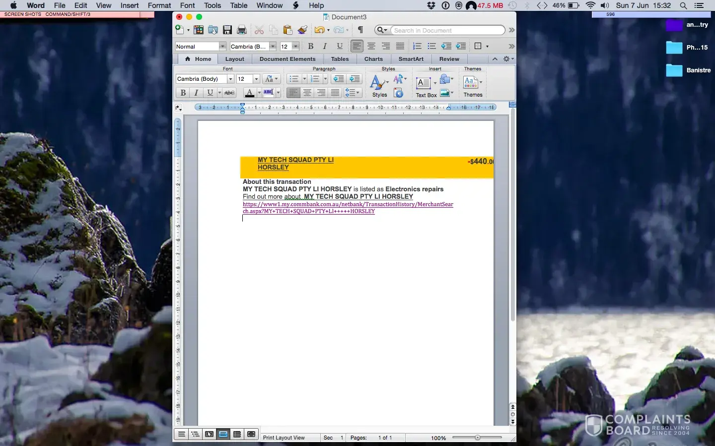 The best I can offer in the way of proof is a screen shot of my Visa account with the money shown to have been taken out by these people. I just hope it's sufficient, I am willing to send you the Visa page but that would compromise my bank details which is never a good idea.