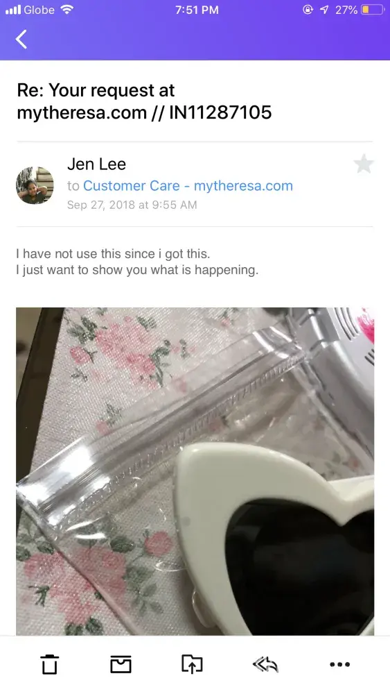 This is the complaint I sent to mytheresa following receiving damaged goods.
