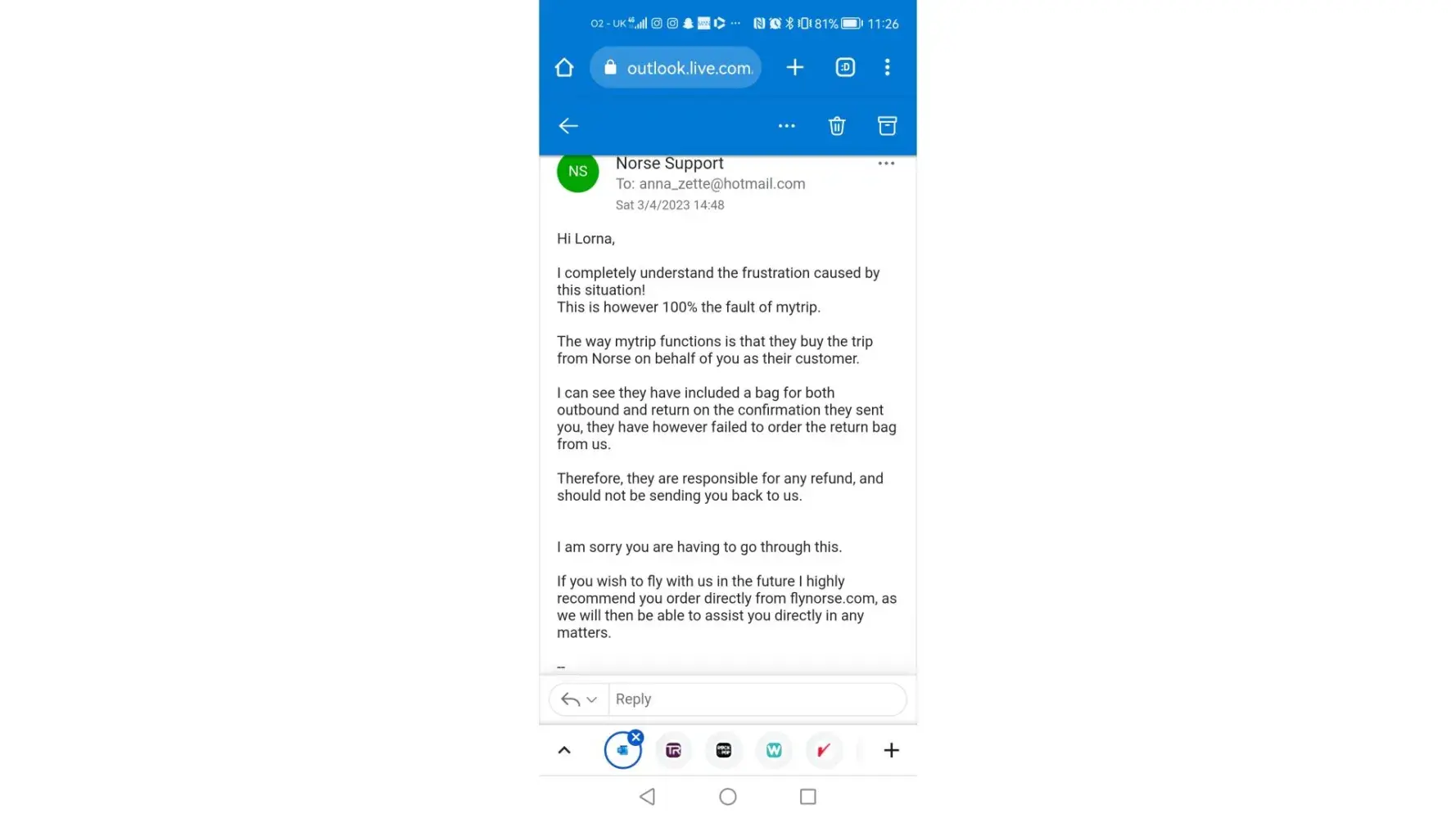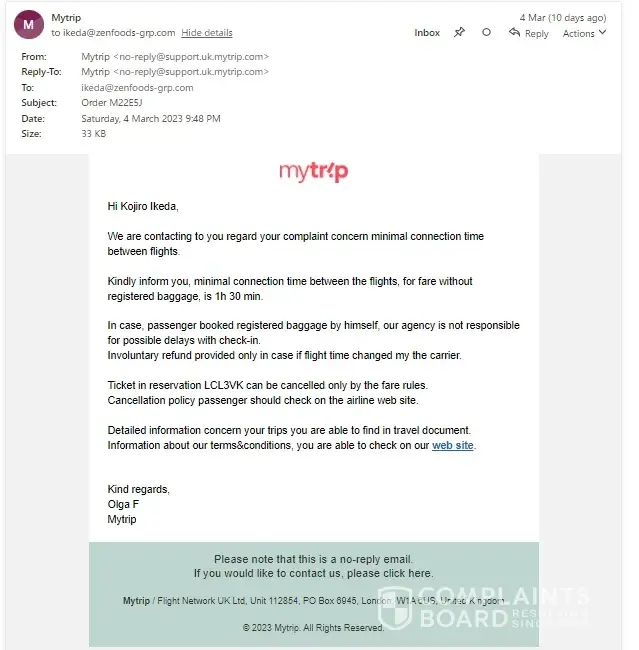 I made a call to the customer service of Mytrip.com at +852 [protected] to inform the situation and they said they were going to handle the issue and get back to me before the end of the day(23rd Feb), but they did not until their email on 28th Feb.