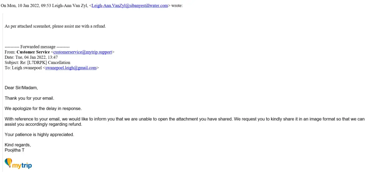 3. Mytrip didn't proceed the request to ITA Airways although they said they would. There is an email confirming this.