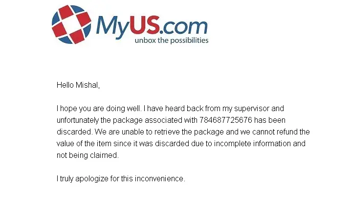 Fedex never delivered by package because MyUS gave them the wrong e-mail address for me. Further, Fedex contacted MyUS on Dec 1 for customs information and not only did they not provide the needed information, they also didn't contact me until 1 week later, which was too late and shipment was thus returned. It's impossible to contact customer service. You have to wait on chat for 2+ hours and no one answers the phone. When I finally managed to get hold of someone, they tried to blame me, and then said the matter needed to be referred to upper management and I would get a response within 1-2 business days. 2 months later and no resolution. Not a single e-mail has been received, other than emails charging me shipping fees. Last week, they attempted to ship the package back. I asked them to cancel the shipment right away and this was not done. I had to call Fedex and cancel it. The last customer service rep cancelled the chat when I asked her to resolve the issue.
