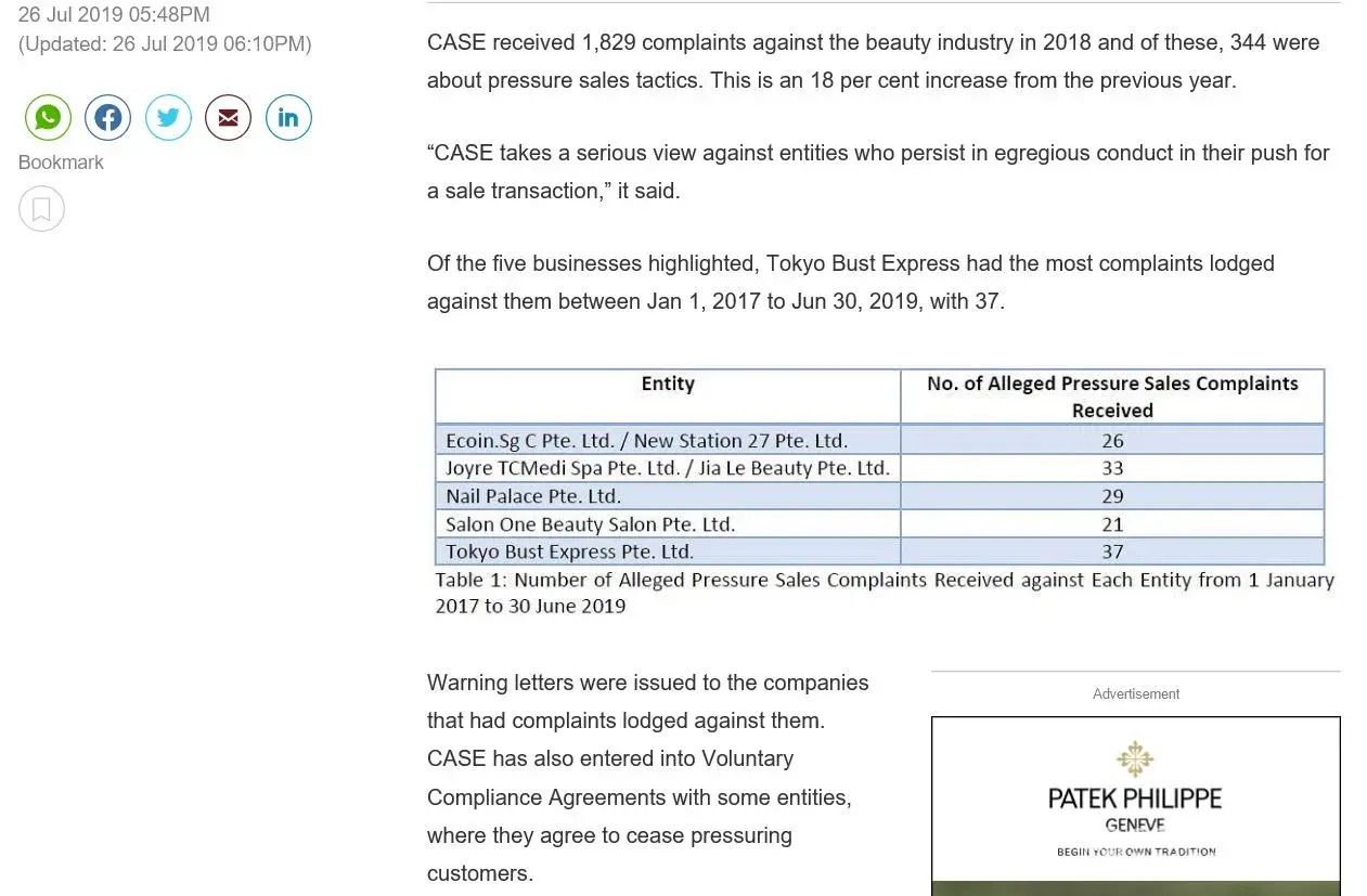 This sharing is to raise awareness among consumers on the unethical pressuing sales ethics of beauty merchant which we personally encountered. Many of these have already been in the news: https://www.straitstimes.com/.../skincare-and-beauty... The most disgusting regarding such merchants is they never admit they are wrong and refused to refund the unused services to us when requested. Unable to settle anything amicably with the branch or their main office, we will consult CASE/Small Claims to take action accordingly.