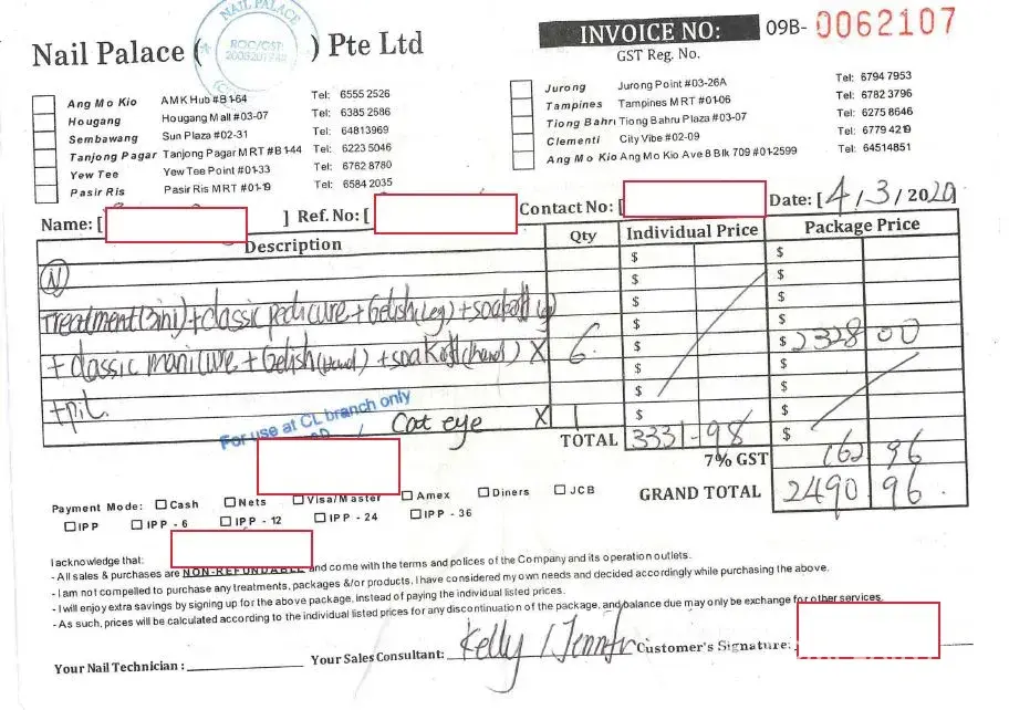 My mum has reported to CASE. She was conned $9k for all the packages, add on etc from October to December. When we look at all the receipts, they just doesn’t make sense. Few transactions do not have any official receipts from Nail Palace. And they make my mum sign on the BLANK official receipts before they fill in the details. My mum managed to take photo of her personal particulars in Nail Palace written record card, and funny thing is my mum is a 55 yo lady, her DOB is 3 August 1994. How can my mum look like a 24 years old girl in their eyes? (Note: my mum isn’t born in August).