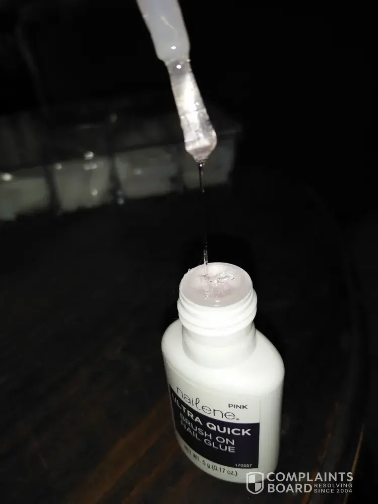 Complaint: having cracked my thumb nail, I opened a new brand new nailene ultra quick glue (pink brush on} to fix it. The top came off easily, but the glue was extremely thick, gooey & elastic stringy, not watery as it normally is, it was unusable. Fortunately, I always buy 2 packs at a time, so had a spare nailene brush on glue in the cupboard. I tried the second one. I was flabbergasted to find that this too was very coagulated & unusable. Obviously there is something wrong with the batch or your quality control.