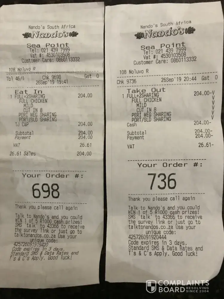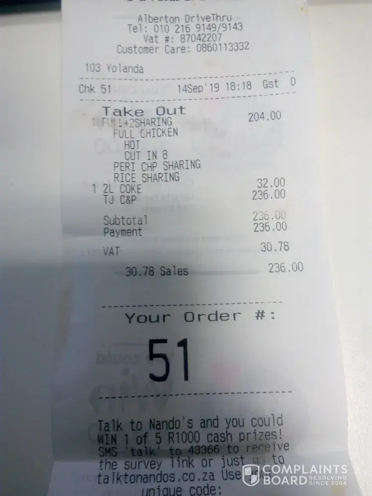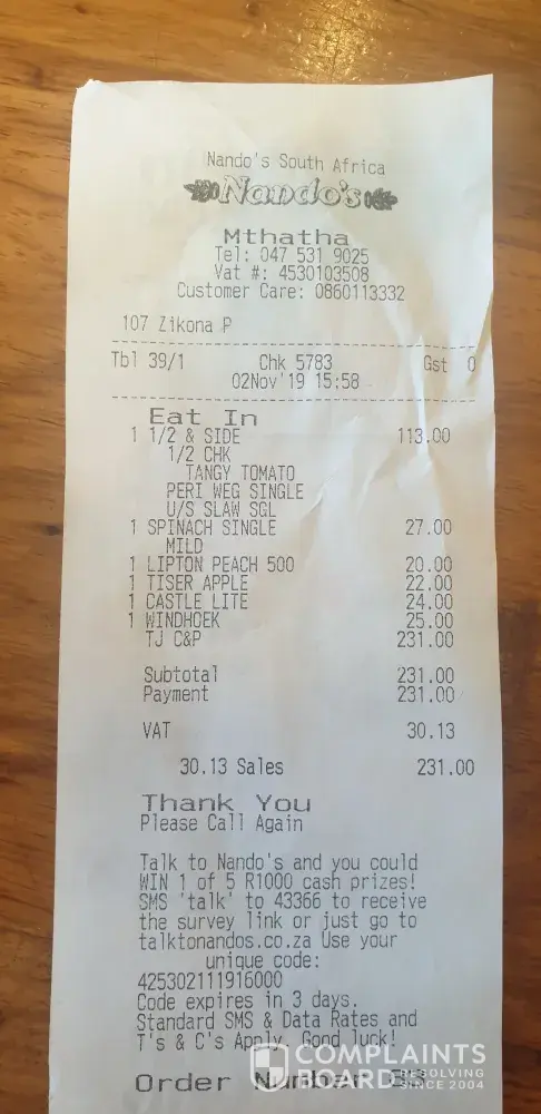 * If the receipt has changed well this is totally unacceptable as we pay the same price and the quality is not up to standards as Nandos used to be before.