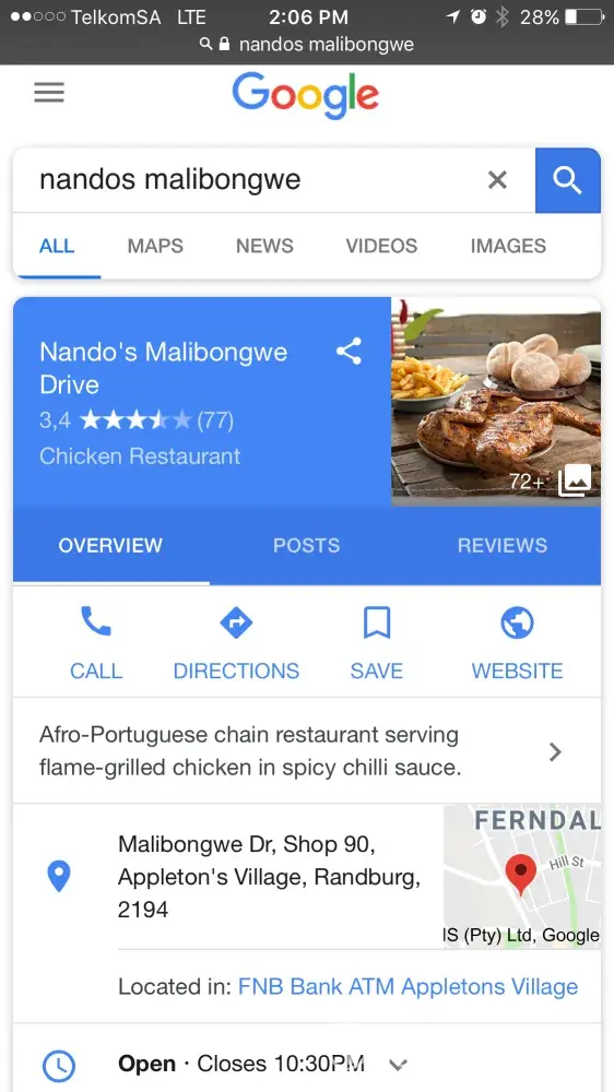 And I live in Samrand, twice I went and bought food from Nandos Midrand and their service and food is horrible, their Green salad wasn't worth it and the pineapple not chopped, previously visited the Nandos in Carslawed and I was impressed, their salad was filling, feta grilled and pineapple grilled, meat juicy, Midrand has left me speechless, their meat was so dry and tiny little pieces of meat, we pay money for those meals not given for free, for the Standard of Nandos Midrand staff is very lazy and service not up to standard, am not happy at.