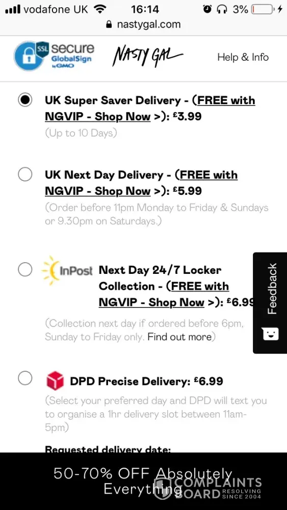 I purchased a pair of boots next day delivery on the 3rd of December at 9.10am well before cut off for next day delivery anyway they failed to deliver and said they had issues with getting orders out yet still advertising next day delivery so they were capable of sending a replacement out but did not and refused to refund. Still don't know where my parcel is or if it will ever come. Disgusting business let's put them out! And boohoo. False advertisement is illegal
