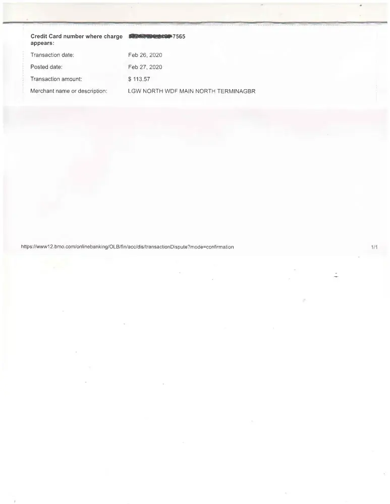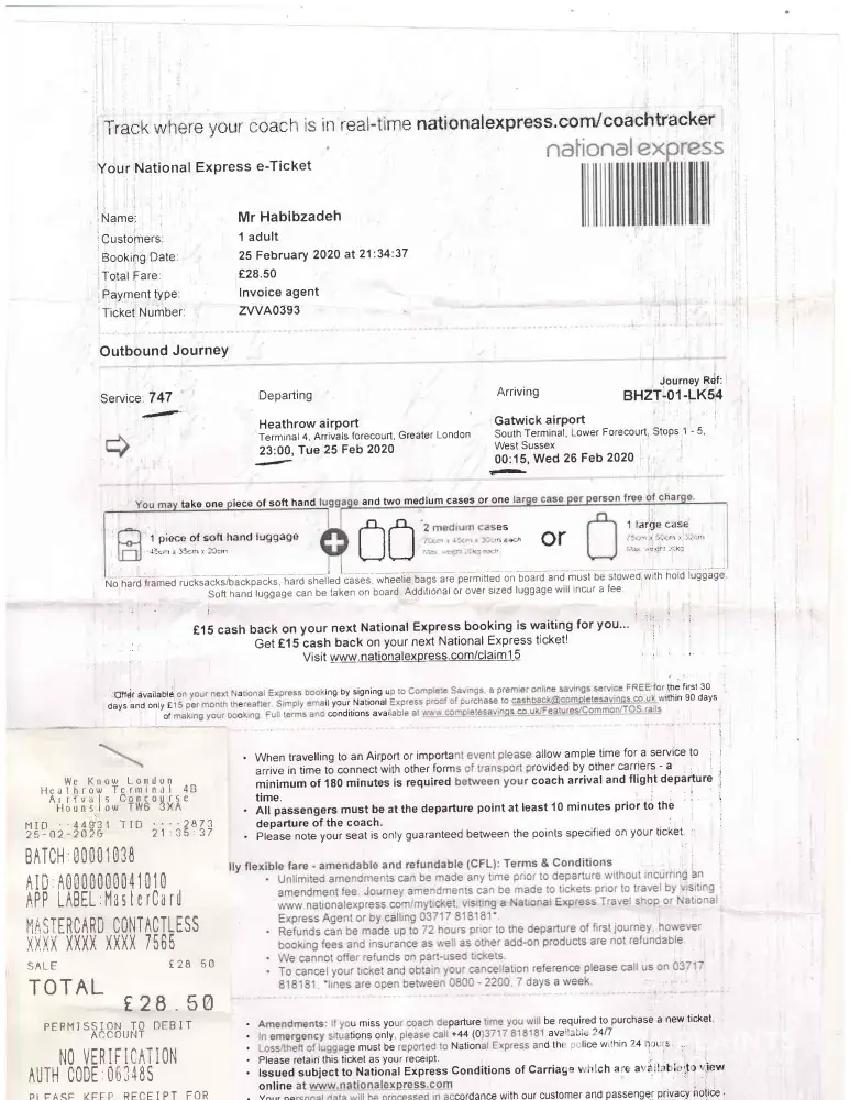 I got a bus ticket from Heathrow airport station to Gatwick airport station at 21.35 pm on 25/02/2020 and paid by my Canadian Mastercard. the price was GBP28.50.