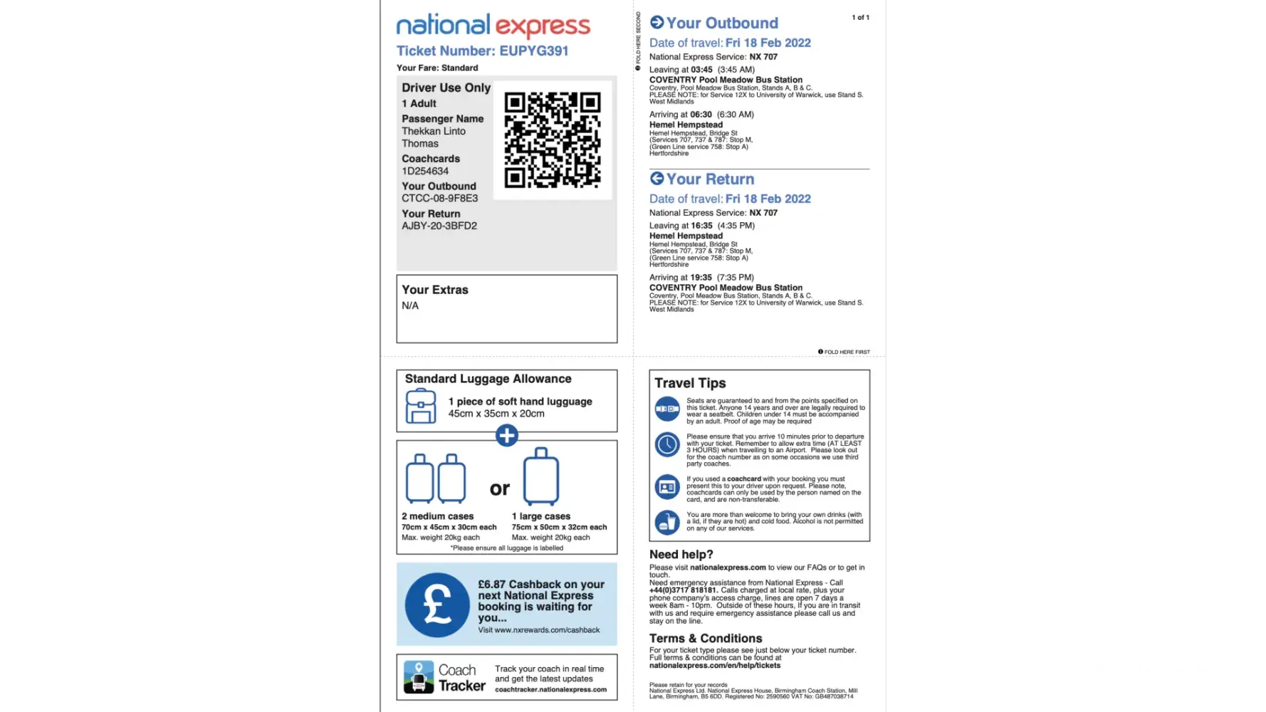 My name is Thekkan Linto Thomas, and I am a student at Hertfordshire University, Hatfield, in Coventry. Every week on Friday, I travel to college for my offline classes, therefore I use the National Express coach bus. My bus leaves Pool Meadow Bus Station at 3:45 a.m. every Friday for Hemel Hempstead and returns at 16:35 p.m. the same day. However, on January 18th, 2022, there was poor weather owing to a storm that started early in the morning, but the bus service continued as usual. I took the bus to my university in the morning, but the bus service did not show up in the evening, even though I had a return ticket. I checked the national express mobile app's real-time position and saw that it was not working, so I decided to phone the national express emergency number, but all I got was a computerized conversion telling me to wait in line. Because the conversation lasted about 30 minutes, I became irritated and decided to wait for the next bus service to arrive at 19:00 hours. Around 18:45 hrs, there was a National Express Service N0:707 departing for Heathrow Airport, so I inquired about the bus service that had not arrived at 16:35 hrs, and he informed me that the bus had been canceled and was advertised on Twitter. I was annoyed hearing this from the driver and asked what I should do now to get home, to which he said that I could either wait for the 22:00hrs bus or take a cab home and then send the bills to National Express to be paid. So, I used the UBER service to get home, and it cost me 105 pounds to get home because it was from the regular pickup spot (Hemel Hempstead). The following day, I submitted a letter to National Express along with my cab trip bill, and I received a letter stating that they are unable to reimburse the money and will only reimburse after the return fare of the journey day, which is 12 pounds. What makes you think that's acceptable? They forced me to stand for an hour with no explanation of the service. And the driver informs me I'll have to wait another 3 hours in the cold for the next service.