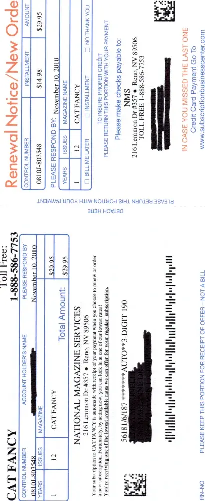 We received a fictitious mailing from "National Magazine Services, Inc." asking me to renew my magazine subscription for 2 years. We took at first glance as a legitimate renewal invoice as our subscription but in reality is a fake subscription as we can see now.