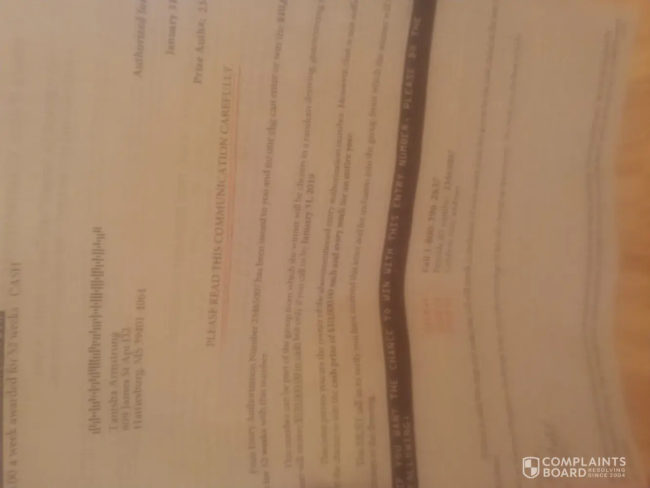 Gave me a authority code told me to call 8003962637 before jan16/2020 say it's a random drawing 520, 000.000 in cash before Jan/2020 say I'm in a drawing for 10, 000 a week but call to confirm my entry from National Magazine exchange came threw the mail to my address I new it wasn't real say yhe reward for 10, 000 is weekly have me 8 digit entry number